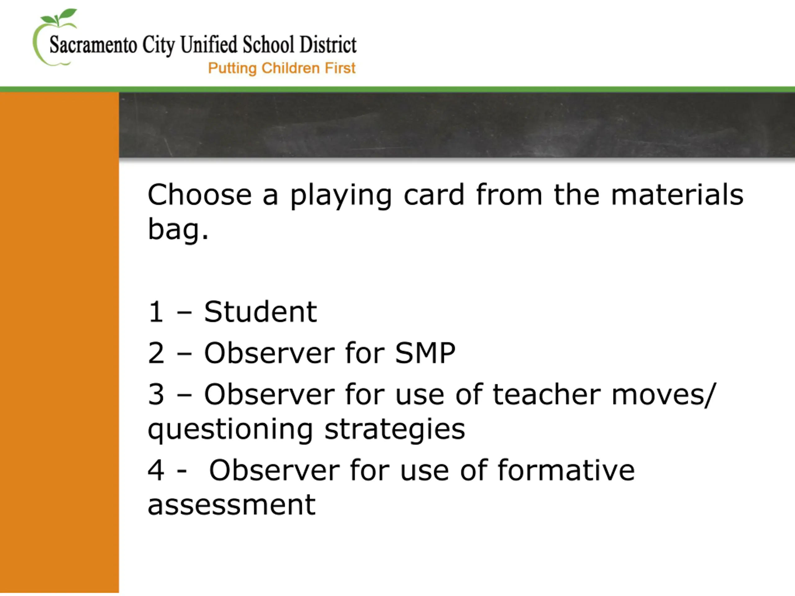 Choose a playing card from the materials bag. 1 Student 2 Observer for SMP 3 Observer for use of teacher moves/ questioning strategies 4 - Observer for use of formative assessment