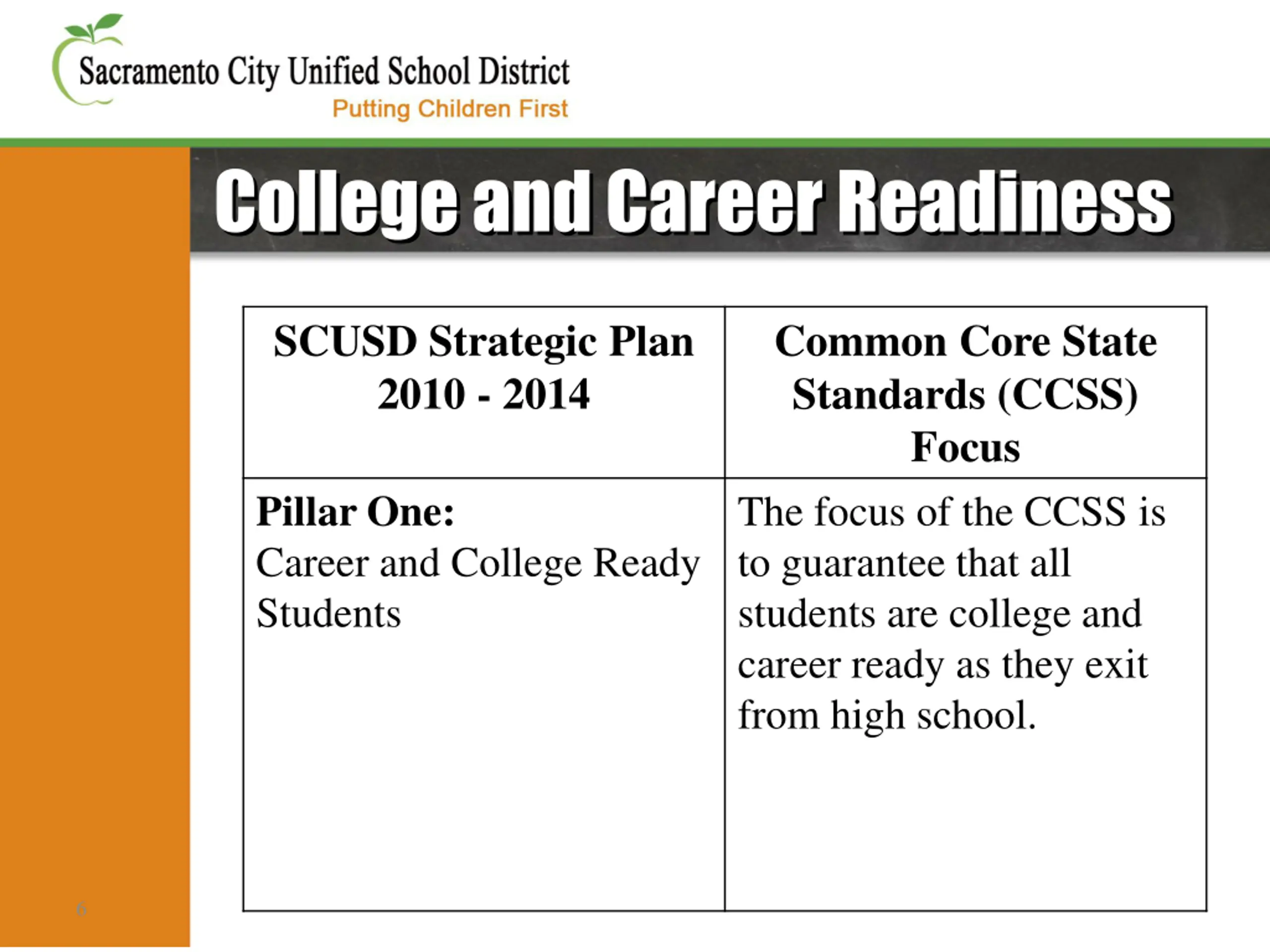 College and Career Readiness SCUSD Strategic Plan 2010 - 2014 Common Core State Standards (CCSS) Focus The focus of the CCSS is to guarantee that all students are college and career ready as they exit from high school. Pillar One: Career and College Ready Students 6