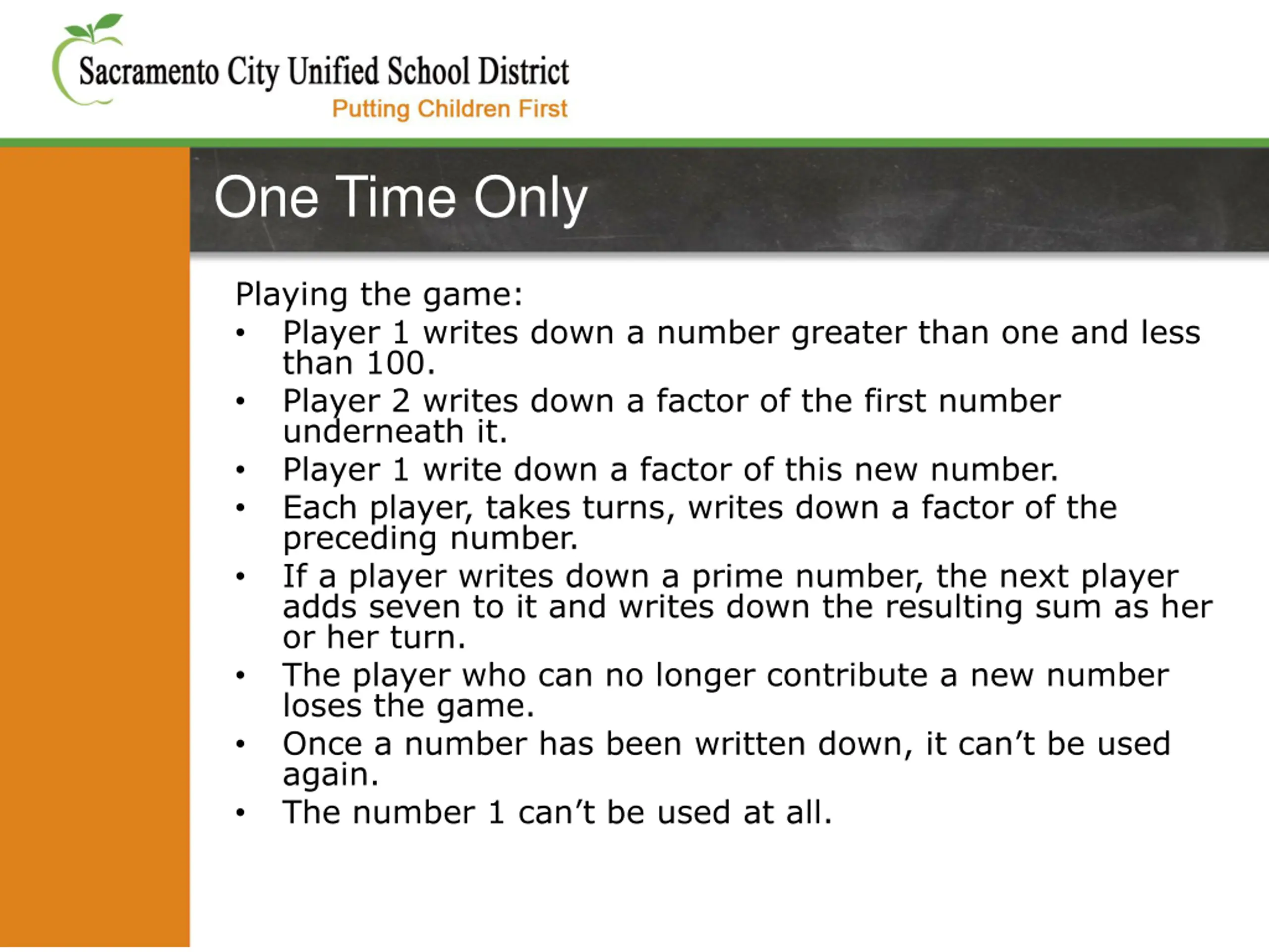 One Time Only Playing the game: Player 1 writes down a number greater than one and less than 100. Player 2 writes down a factor of the first number underneath it. Player 1 write down a factor of this new number. Each player, takes turns, writes down a factor of the preceding number. If a player writes down a prime number, the next player adds seven to it and writes down the resulting sum as her or her turn. The player who can no longer contribute a new number loses the game. Once a number has been written down, it can t be used again. The number 1 can t be used at all.