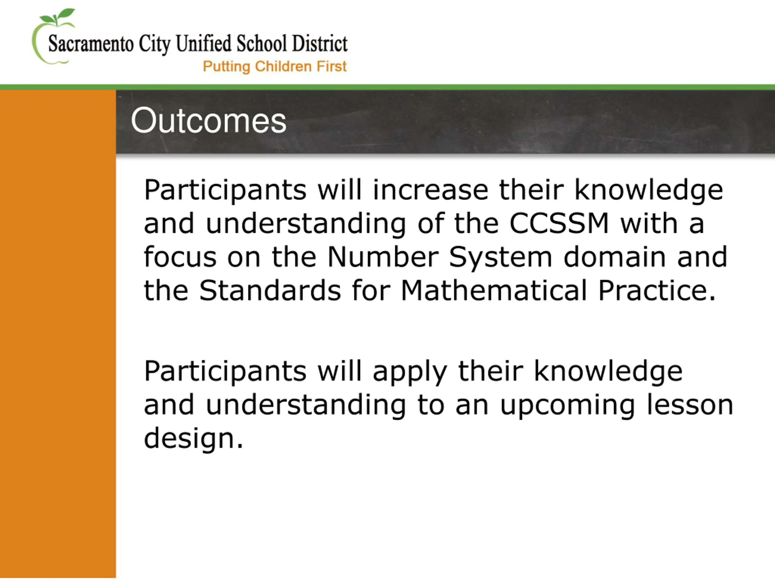 Outcomes Participants will increase their knowledge and understanding of the CCSSM with a focus on the Number System domain and the Standards for Mathematical Practice. Participants will apply their knowledge and understanding to an upcoming lesson design.