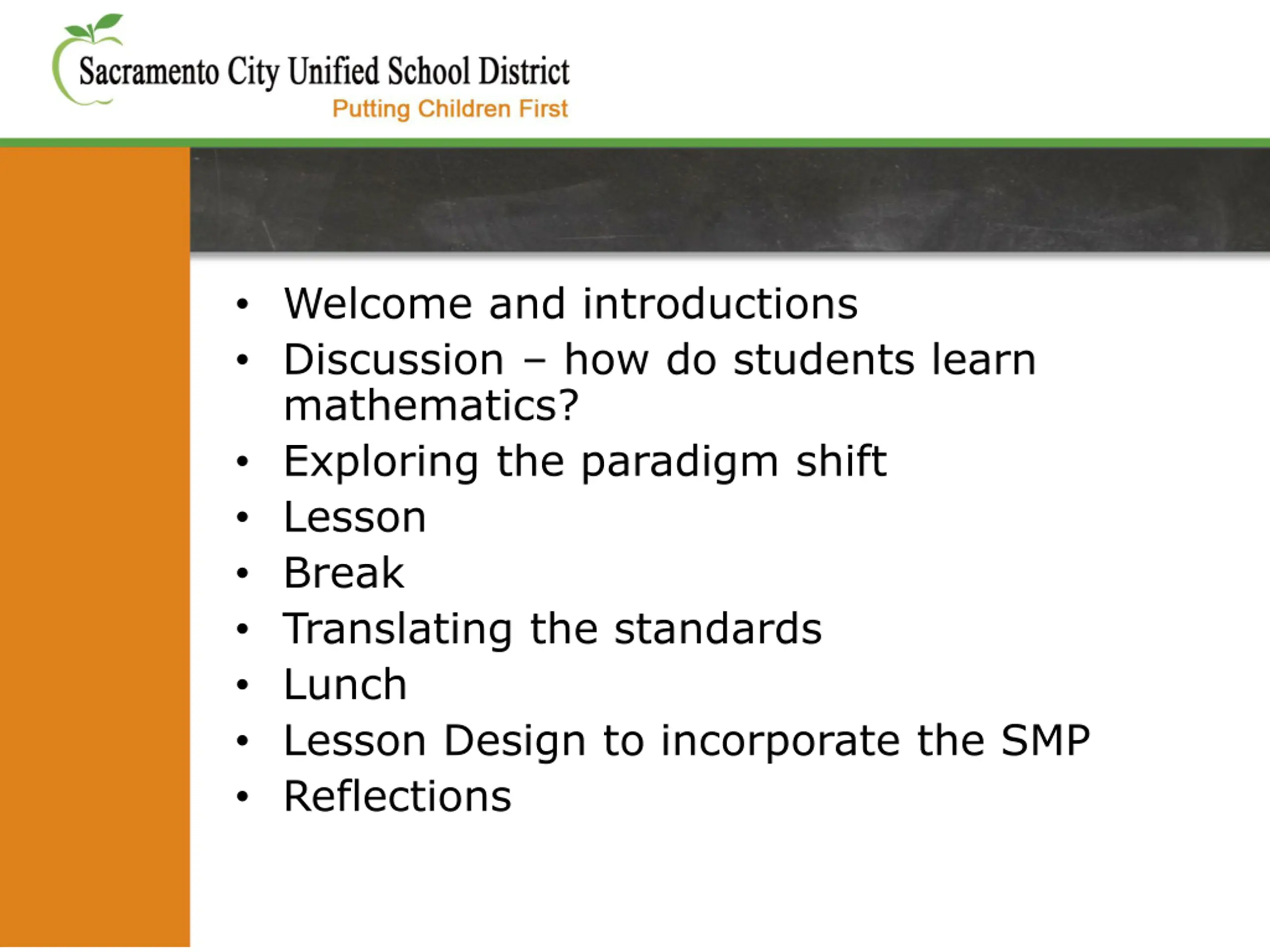 Welcome and introductions Discussion how do students learn mathematics? Exploring the paradigm shift Lesson Break Translating the standards Lunch Lesson Design to incorporate the SMP Reflections