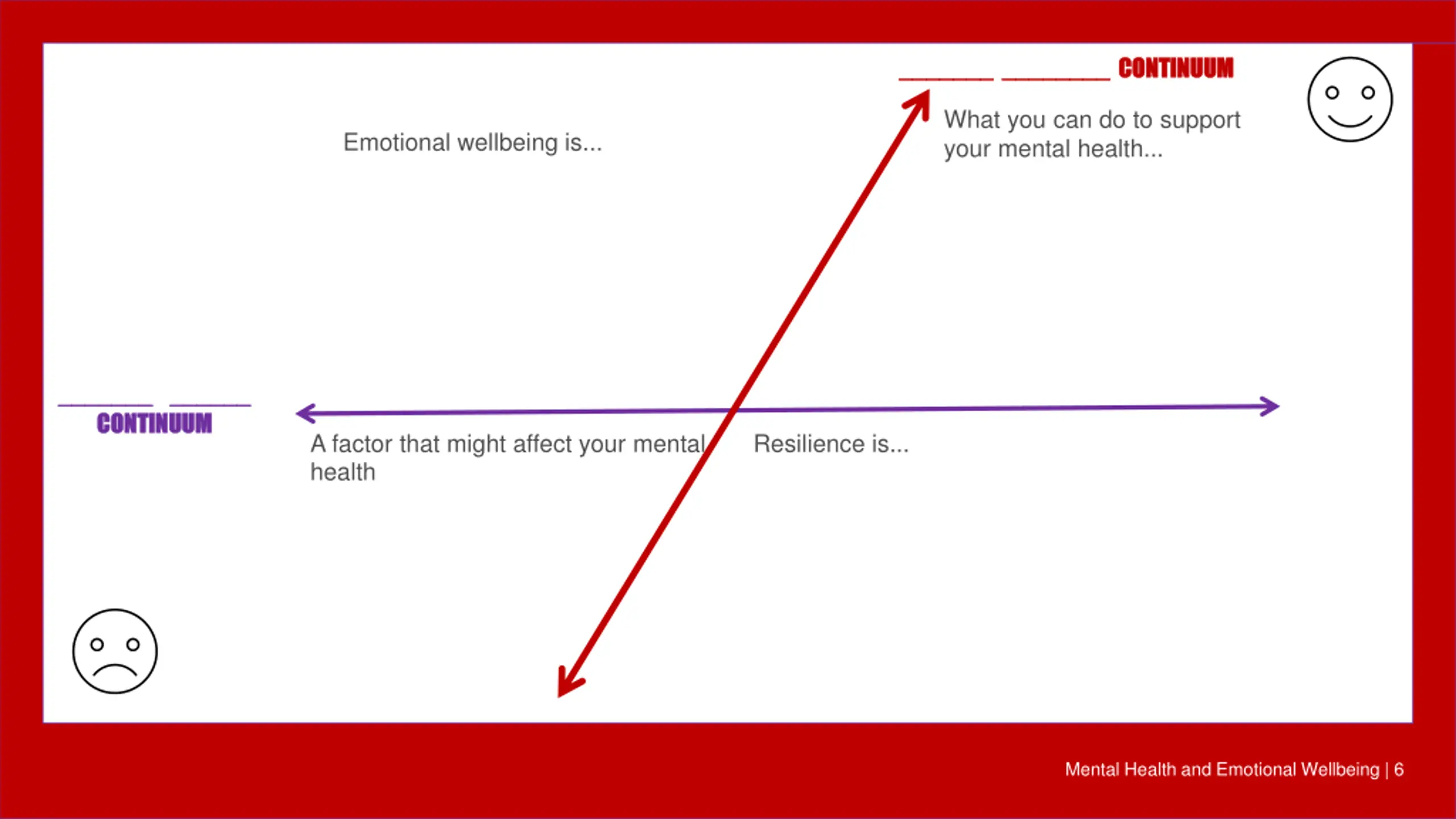 _______ _______ ________ ________ CONTINUUM CONTINUUM What you can do to support your mental health... Emotional wellbeing is... _______ _______ ______ CONTINUUM CONTINUUM ______ A factor that might affect your mental health Resilience is... Mental Health and Emotional Wellbeing | 6