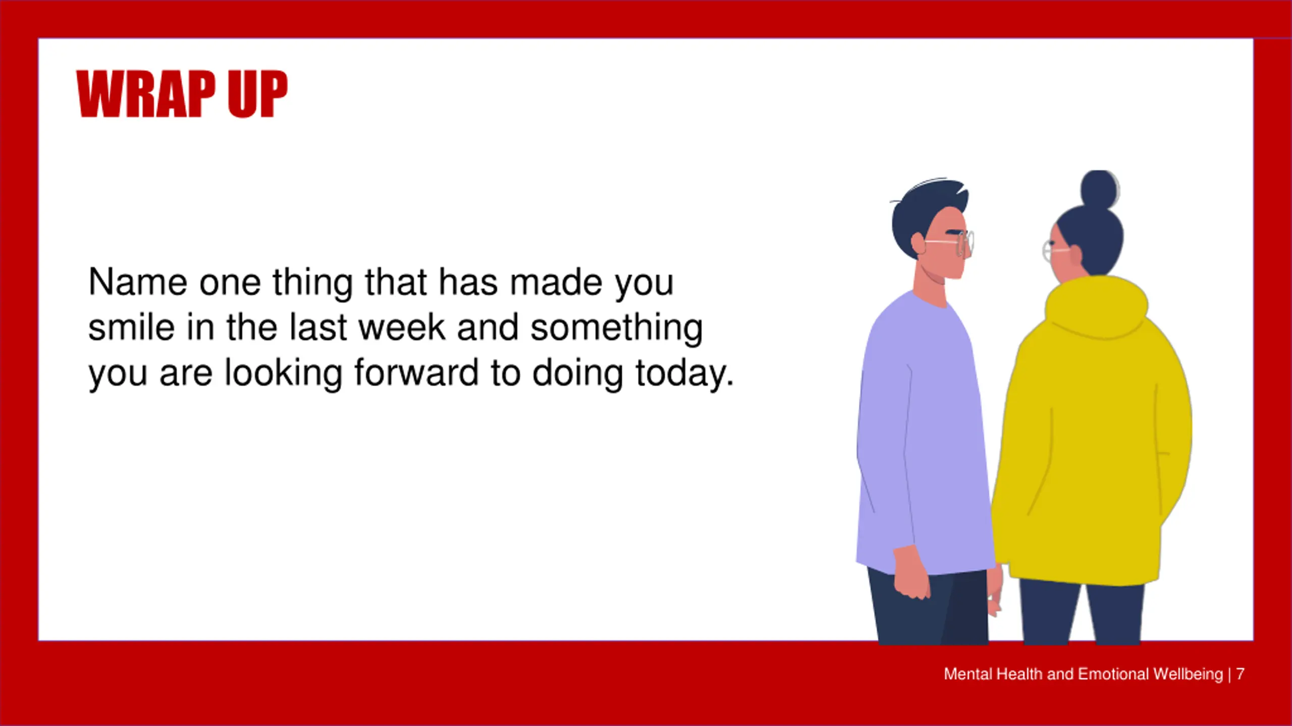 WRAP UP Name one thing that has made you smile in the last week and something you are looking forward to doing today. Mental Health and Emotional Wellbeing | 7