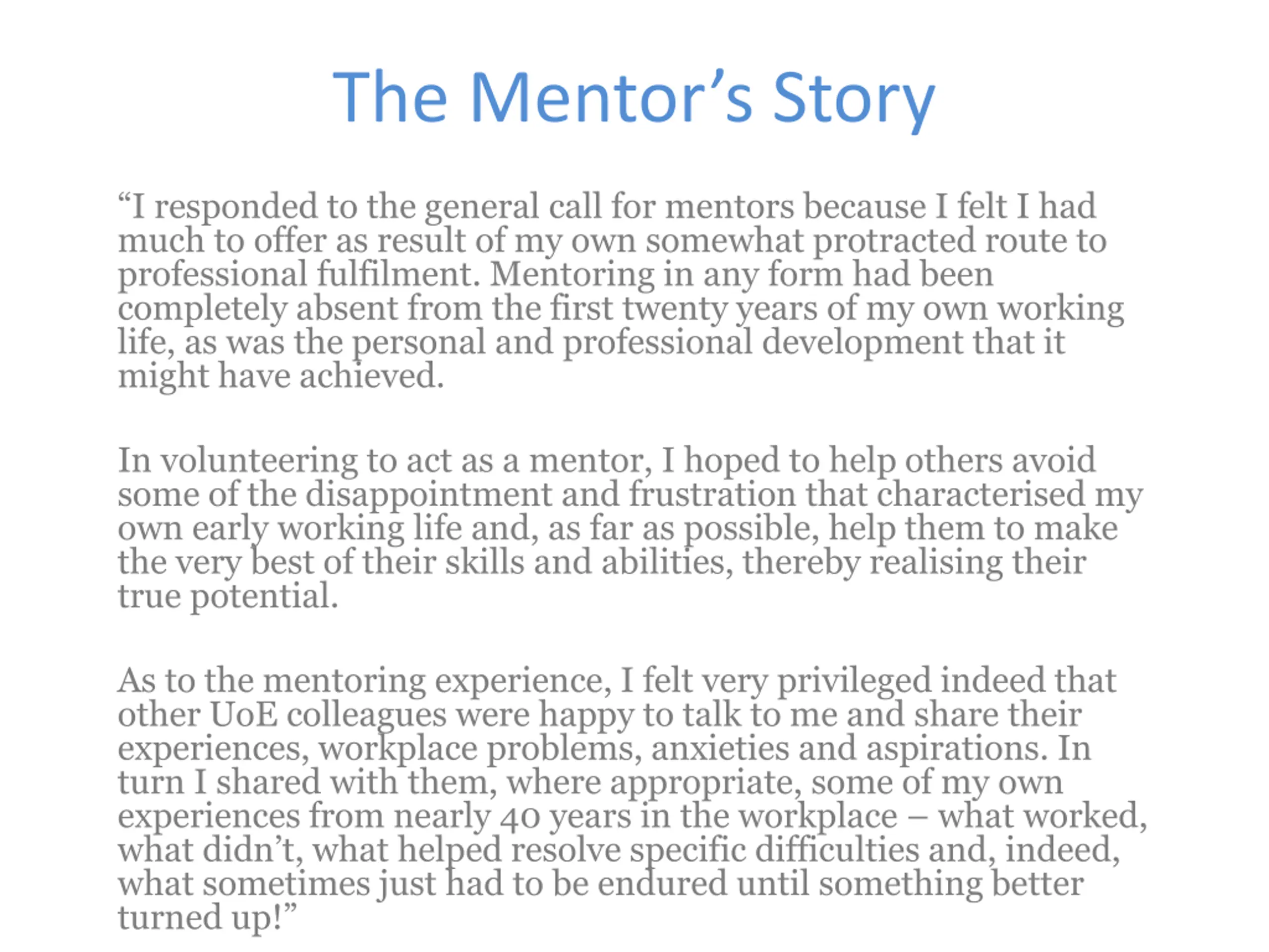 The Mentors Story I responded to the general call for mentors because I felt I had much to offer as result of my own somewhat protracted route to professional fulfilment. Mentoring in any form had been completely absent from the first twenty years of my own working life, as was the personal and professional development that it might have achieved. In volunteering to act as a mentor, I hoped to help others avoid some of the disappointment and frustration that characterised my own early working life and, as far as possible, help them to make the very best of their skills and abilities, thereby realising their true potential. As to the mentoring experience, I felt very privileged indeed that other UoE colleagues were happy to talk to me and share their experiences, workplace problems, anxieties and aspirations. In turn I shared with them, where appropriate, some of my own experiences from nearly 40 years in the workplace what worked, what didn t, what helped resolve specific difficulties and, indeed, what sometimes just had to be endured until something better turned up!