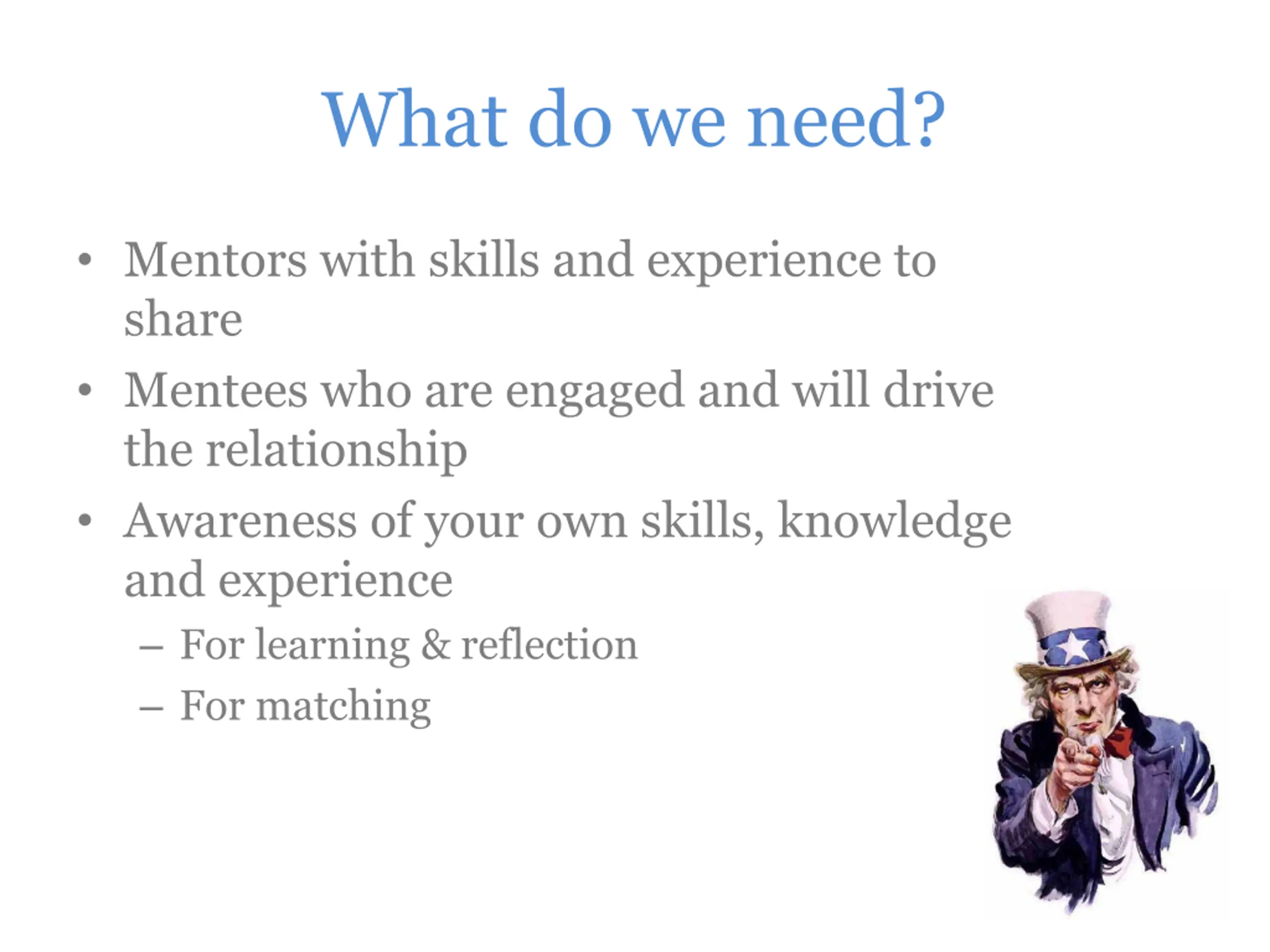 What do we need? Mentors with skills and experience to share Mentees who are engaged and will drive the relationship Awareness of your own skills, knowledge and experience For learning & reflection For matching