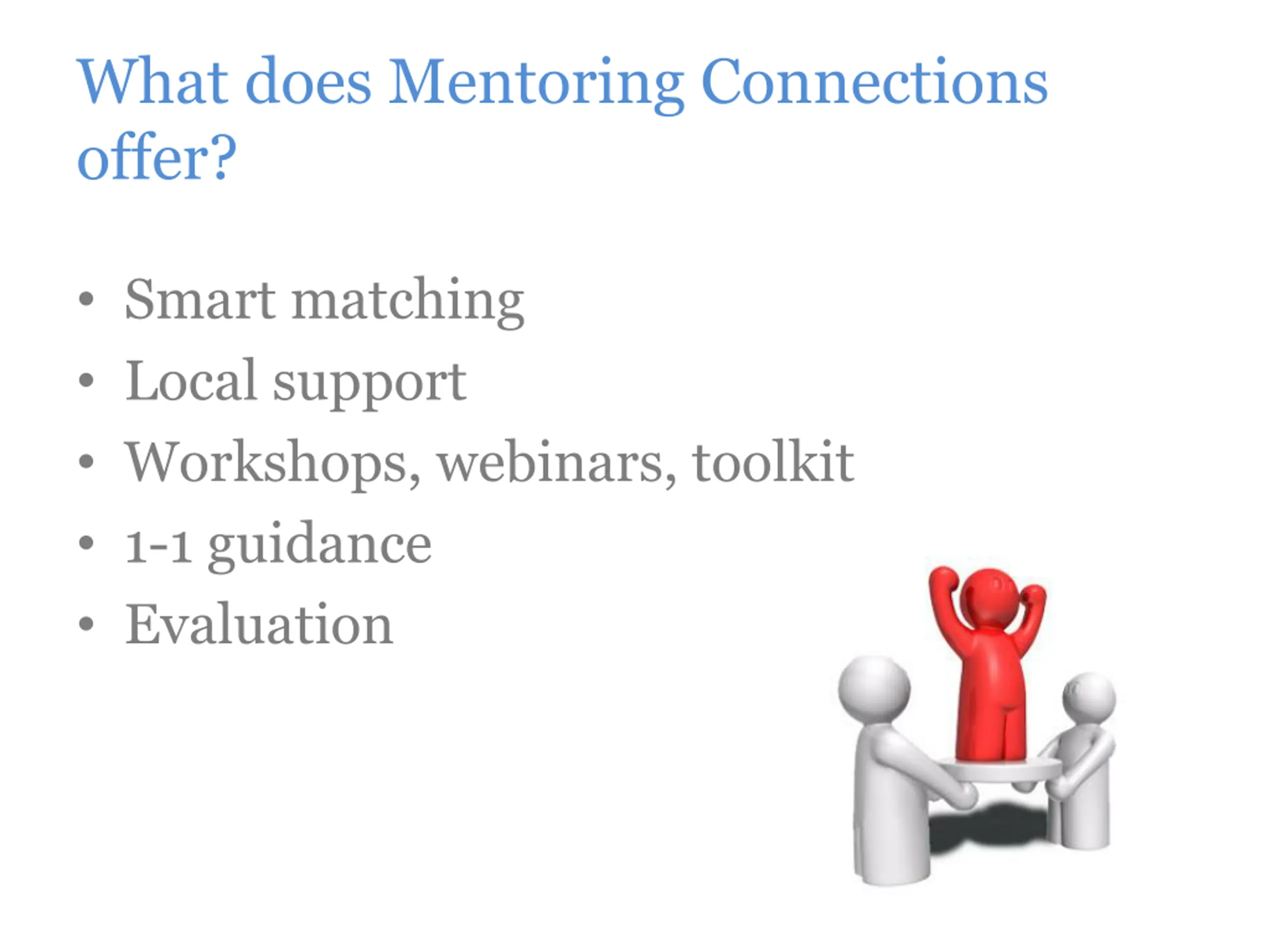 What does Mentoring Connections offer? Smart matching Local support Workshops, webinars, toolkit 1-1 guidance Evaluation