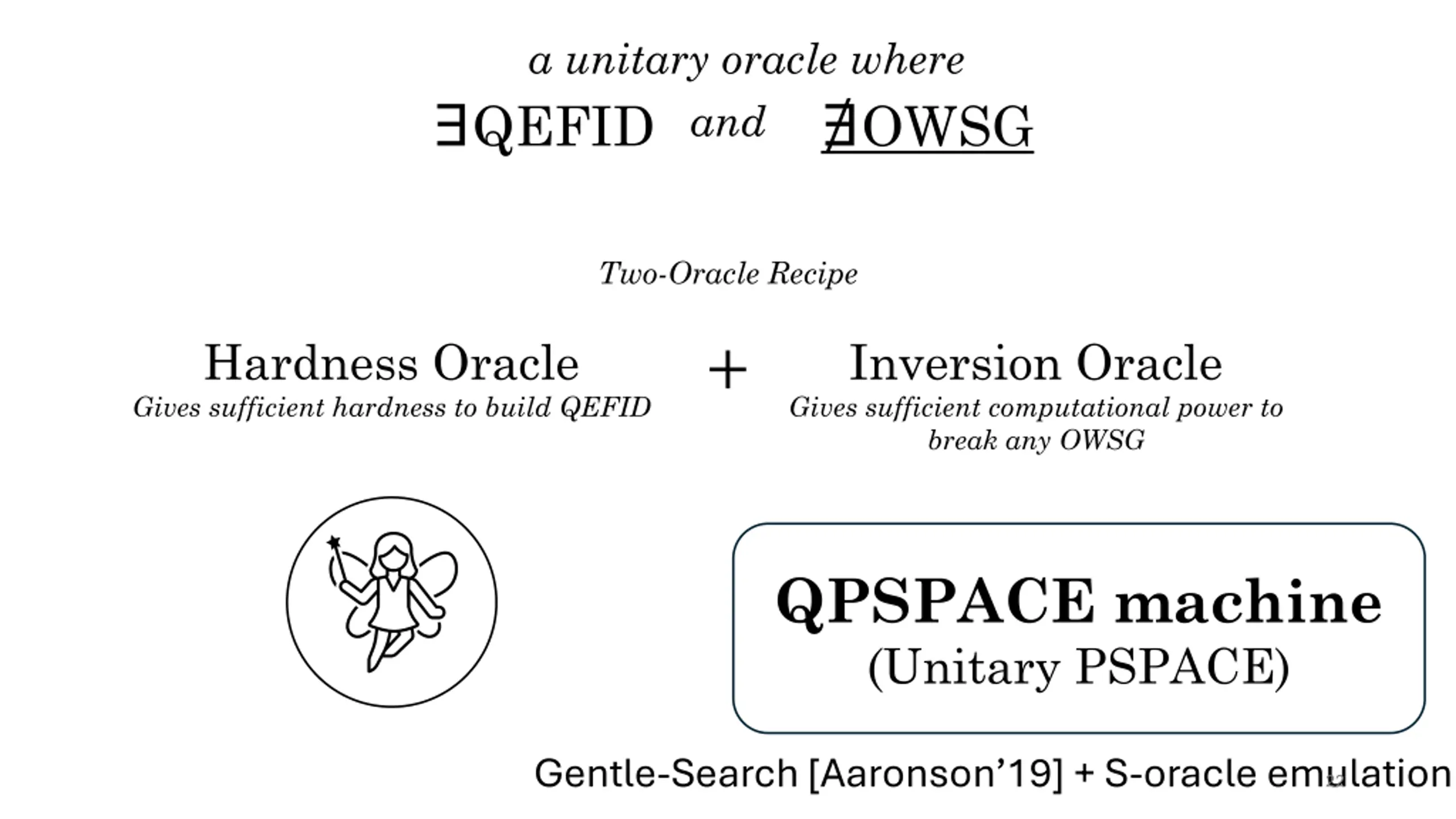 a unitary oracle where QEFID and OWSG Two-Oracle Recipe Hardness Oracle Gives sufficient hardness to build QEFID Inversion Oracle Gives sufficient computational power to break any OWSG + 21