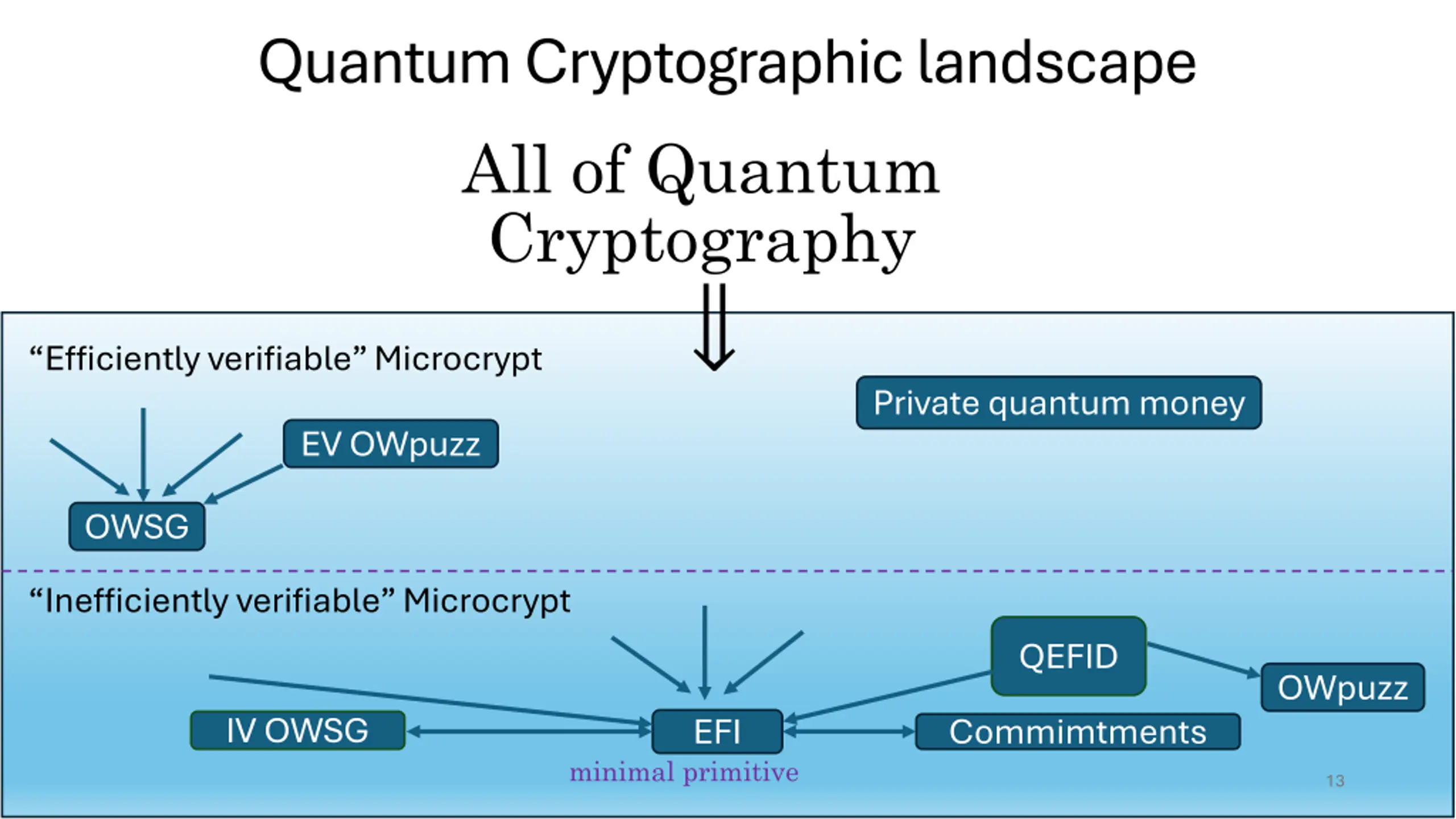 Quantum Cryptographic landscape All of Quantum Cryptography Efficiently verifiable Microcrypt Private quantum money EV OWpuzz OWSG Inefficiently verifiable Microcrypt QEFID OWpuzz IV OWSG EFI Commimtments minimal primitive 13