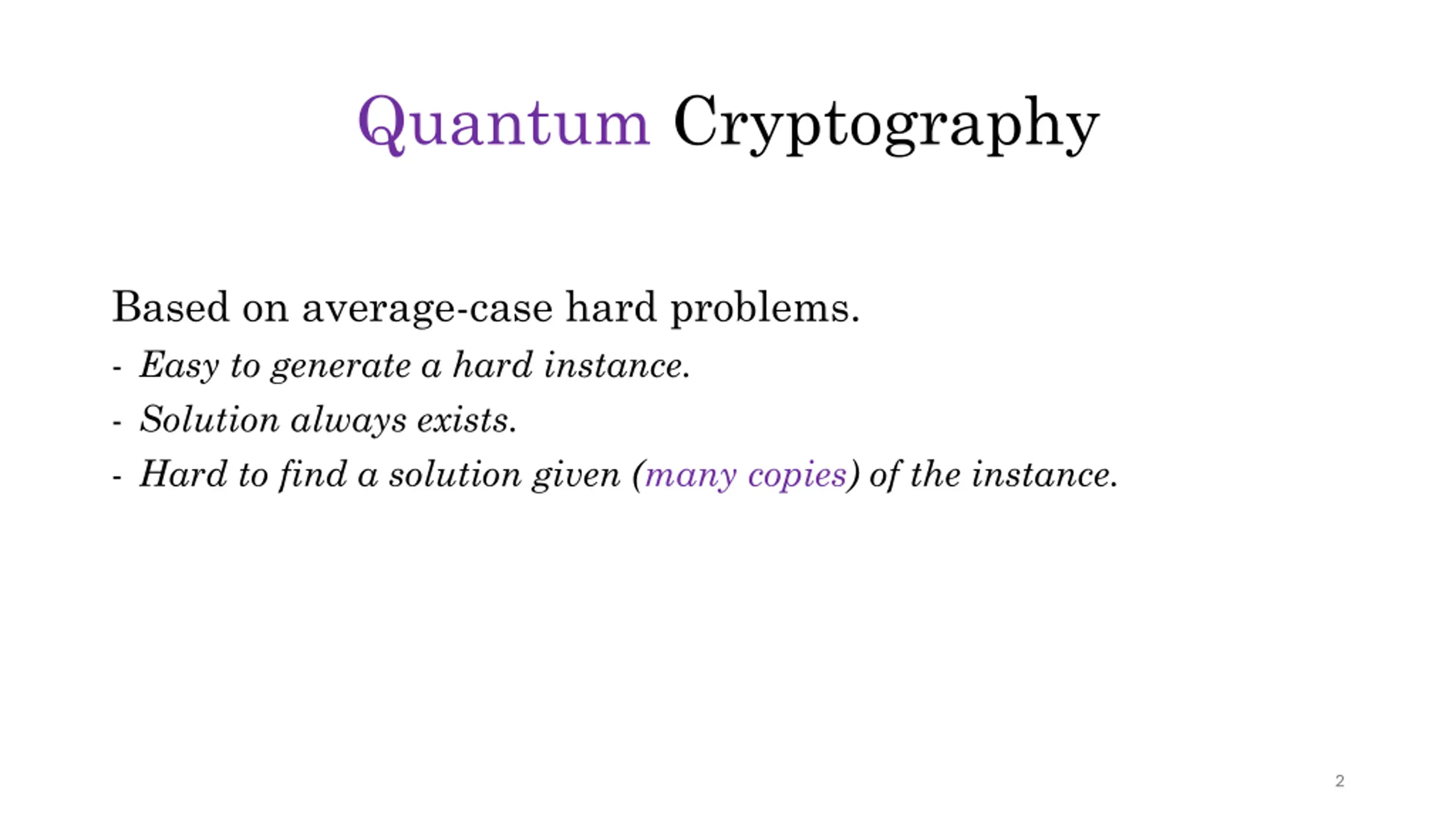 Quantum Cryptography Based on average-case hard problems. - Easy to generate a hard instance. - Solution always exists. - Hard to find a solution given (many copies) of the instance. 2