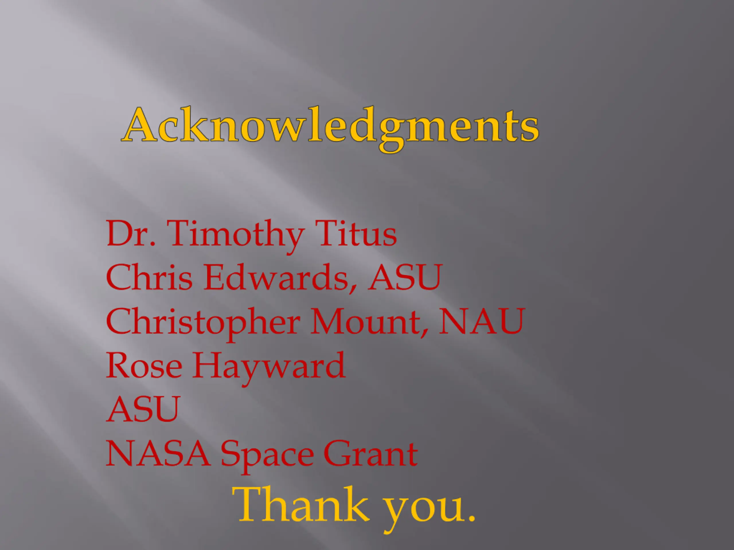 Acknowledgments Dr. Timothy Titus Chris Edwards, ASU Christopher Mount, NAU Rose Hayward ASU NASA Space Grant Thank you.