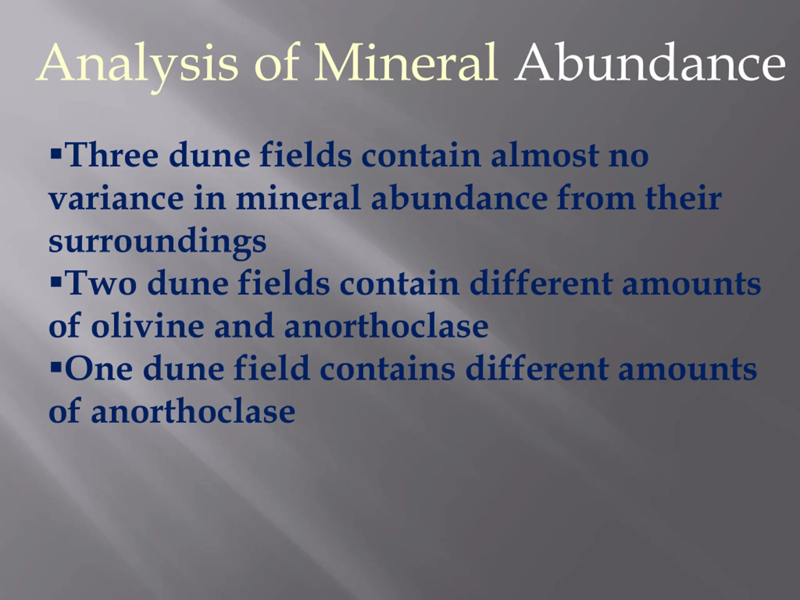Analysis of Mineral Abundance Three dune fields contain almost no variance in mineral abundance from their surroundings Two dune fields contain different amounts of olivine and anorthoclase One dune field contains different amounts of anorthoclase