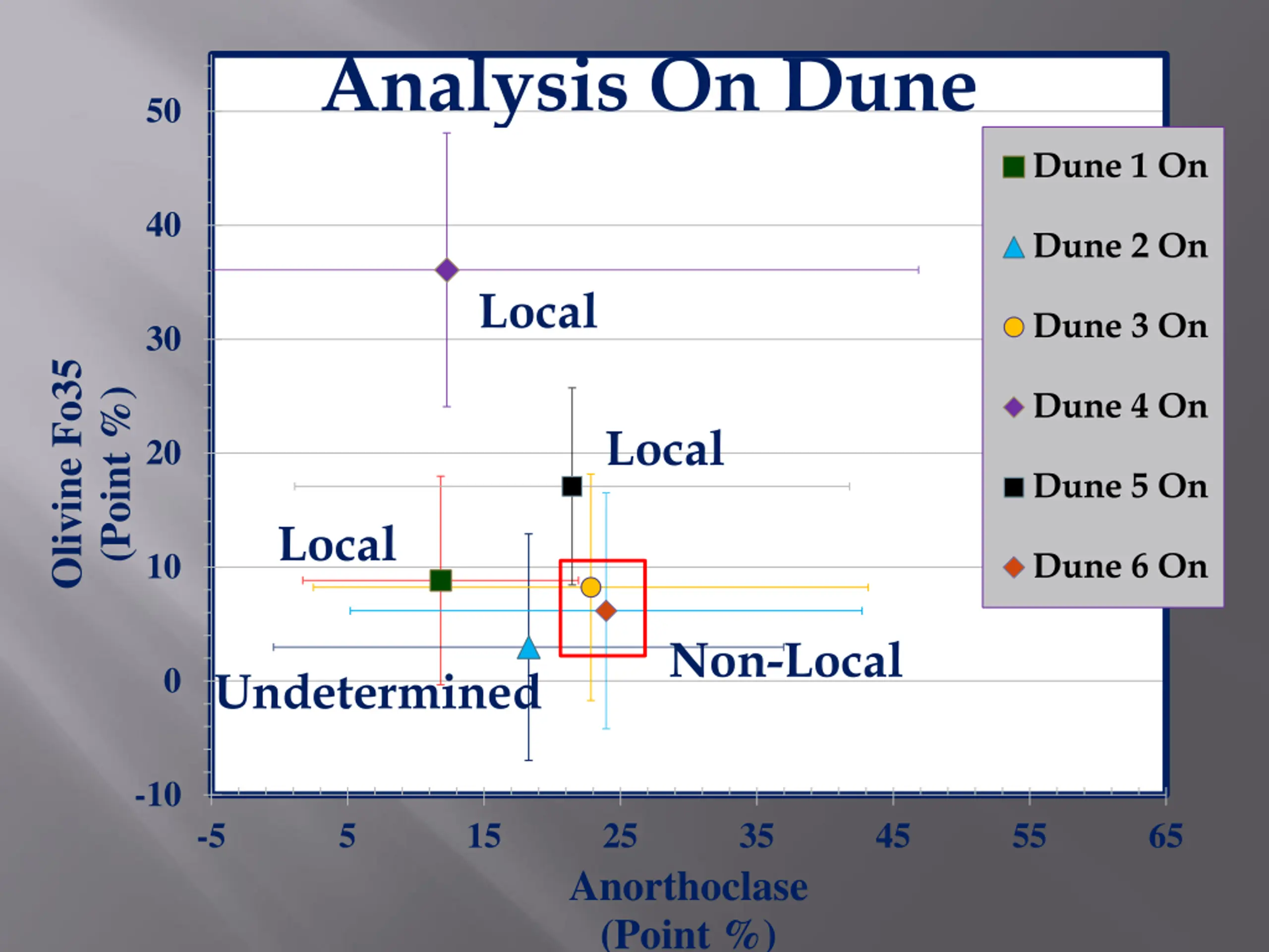 Analysis On Dune 50 Dune 1 On 40 Dune 2 On Local Dune 3 On 30 Olivine Fo35 Dune 4 On (Point %) Local 20 Dune 5 On Local 10 Dune 6 On Non-Local 0 Undetermined -10 -5 5 15 25 35 45 55 65 Anorthoclase (Point %)