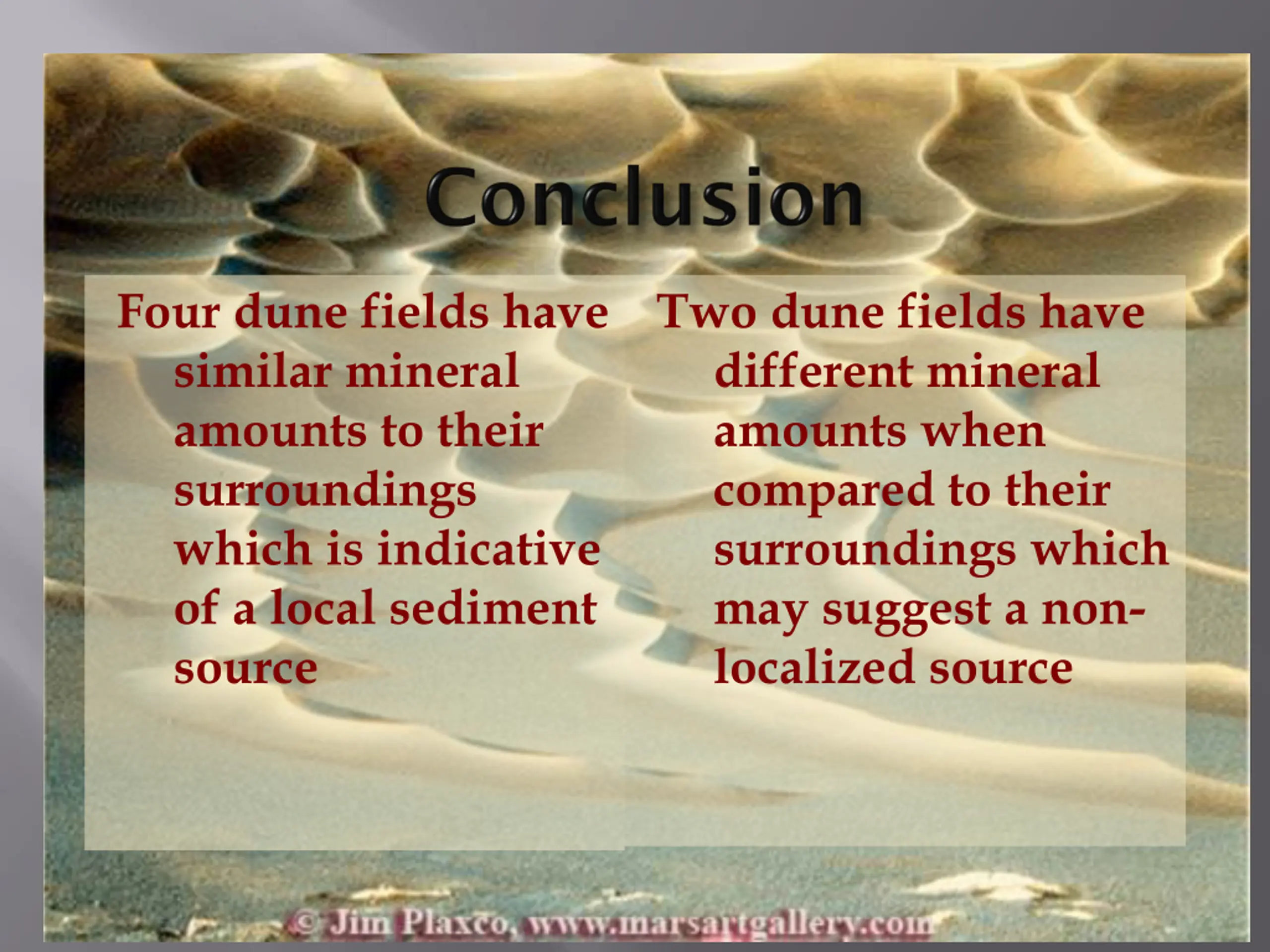 Four dune fields have similar mineral amounts to their surroundings which is indicative of a local sediment source Two dune fields have different mineral amounts when compared to their surroundings which may suggest a non- localized source