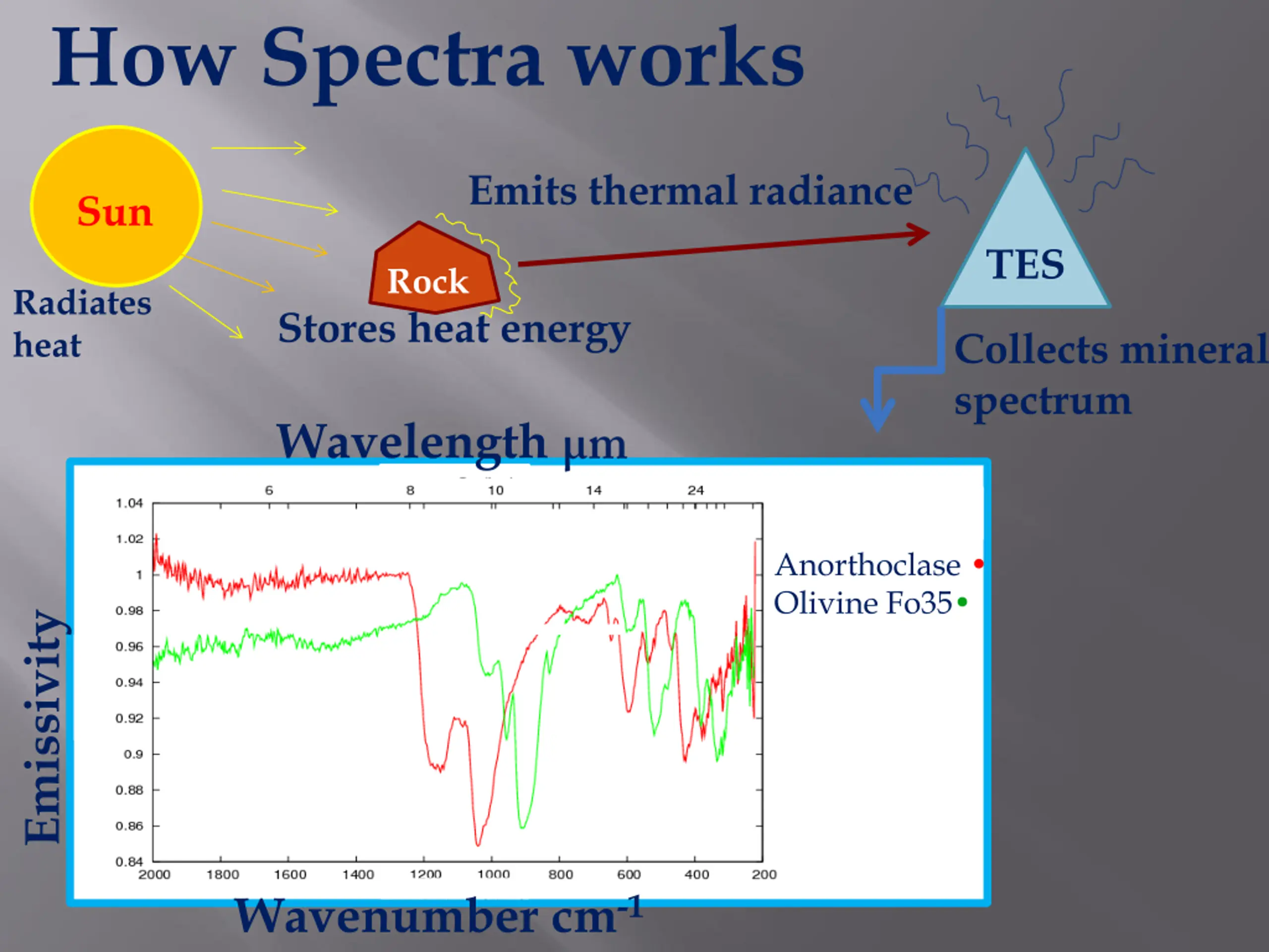 How Spectra works Emits thermal radiance Sun TES Rock Radiates heat Stores heat energy Collects mineral spectrum Wavelength Anorthoclase Olivine Fo35 Emissivity Wavenumber cm-1