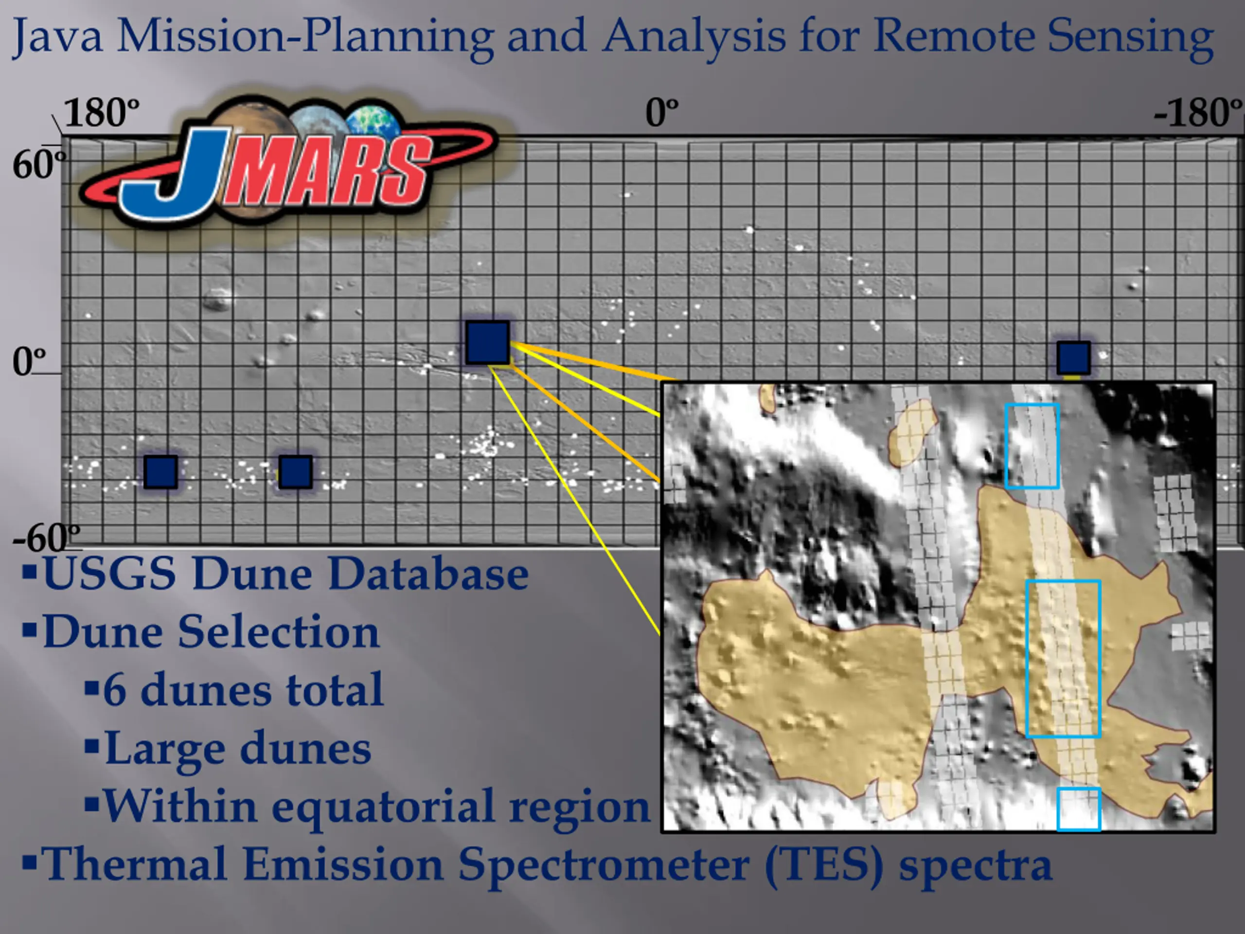 Java Mission-Planning and Analysis for Remote Sensing Home 180 0 -180 60 0 -60 USGS Dune Database Dune Selection 6 dunes total Large dunes Within equatorial region Thermal Emission Spectrometer (TES) spectra