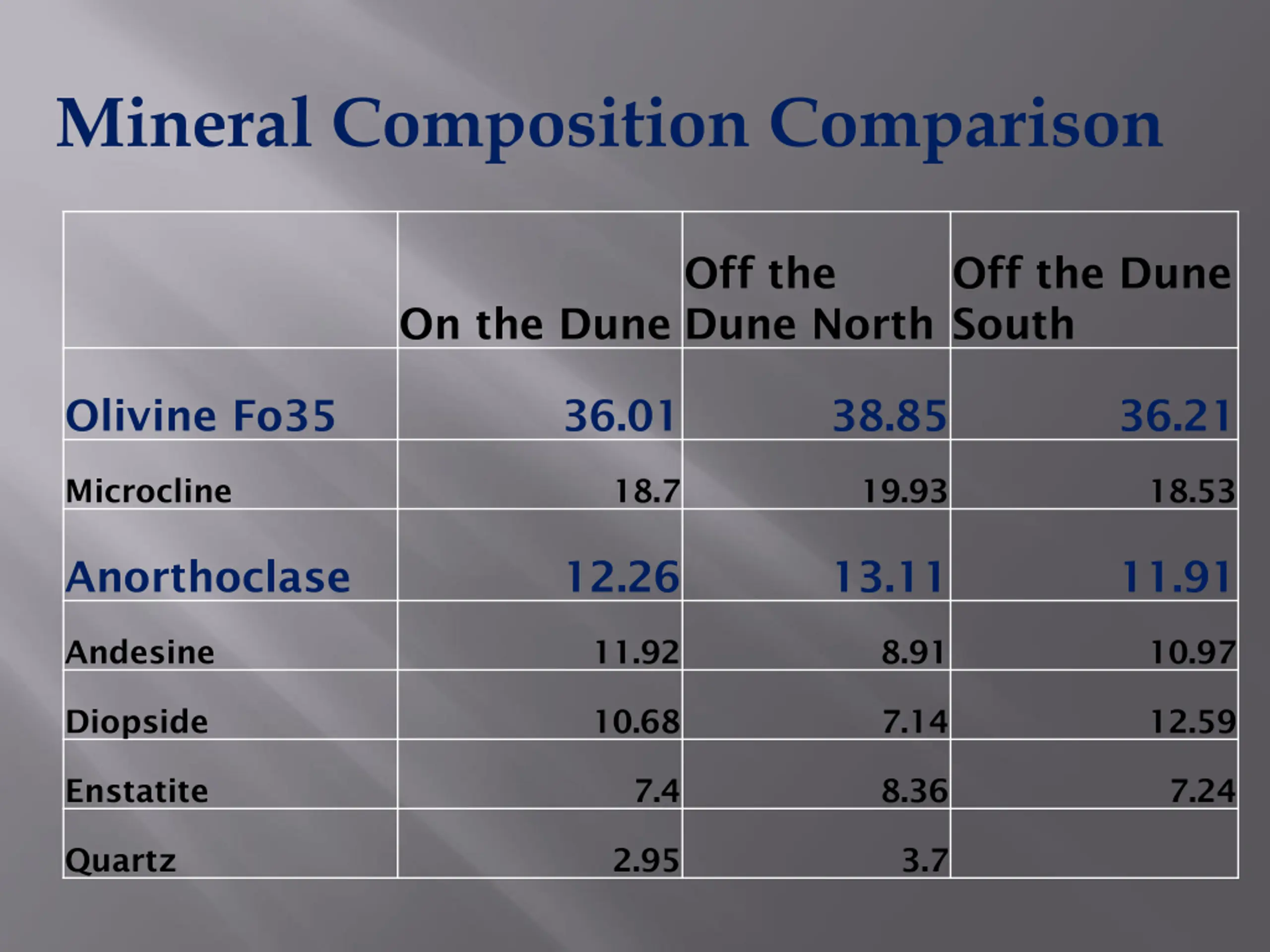 Mineral Composition Comparison Off the Dune North Off the Dune South On the Dune Olivine Fo35 36.01 38.85 36.21 Microcline 18.7 19.93 18.53 Anorthoclase 12.26 13.11 11.91 Andesine 11.92 8.91 10.97 Diopside 10.68 7.14 12.59 Enstatite 7.4 8.36 7.24 Quartz 2.95 3.7