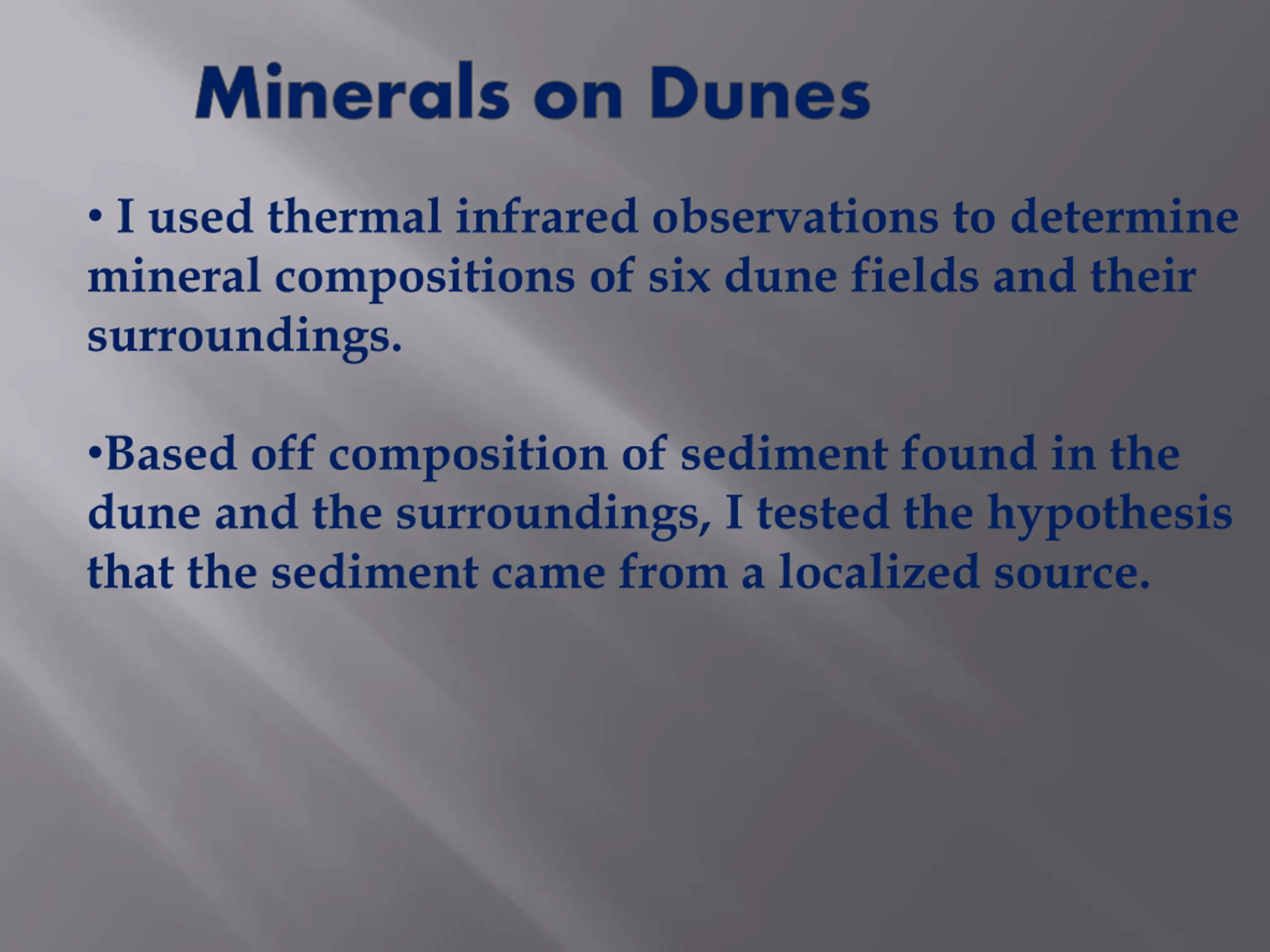 Minerals on Dunes I used thermal infrared observations to determine mineral compositions of six dune fields and their surroundings. Based off composition of sediment found in the dune and the surroundings, I tested the hypothesis that the sediment came from a localized source.