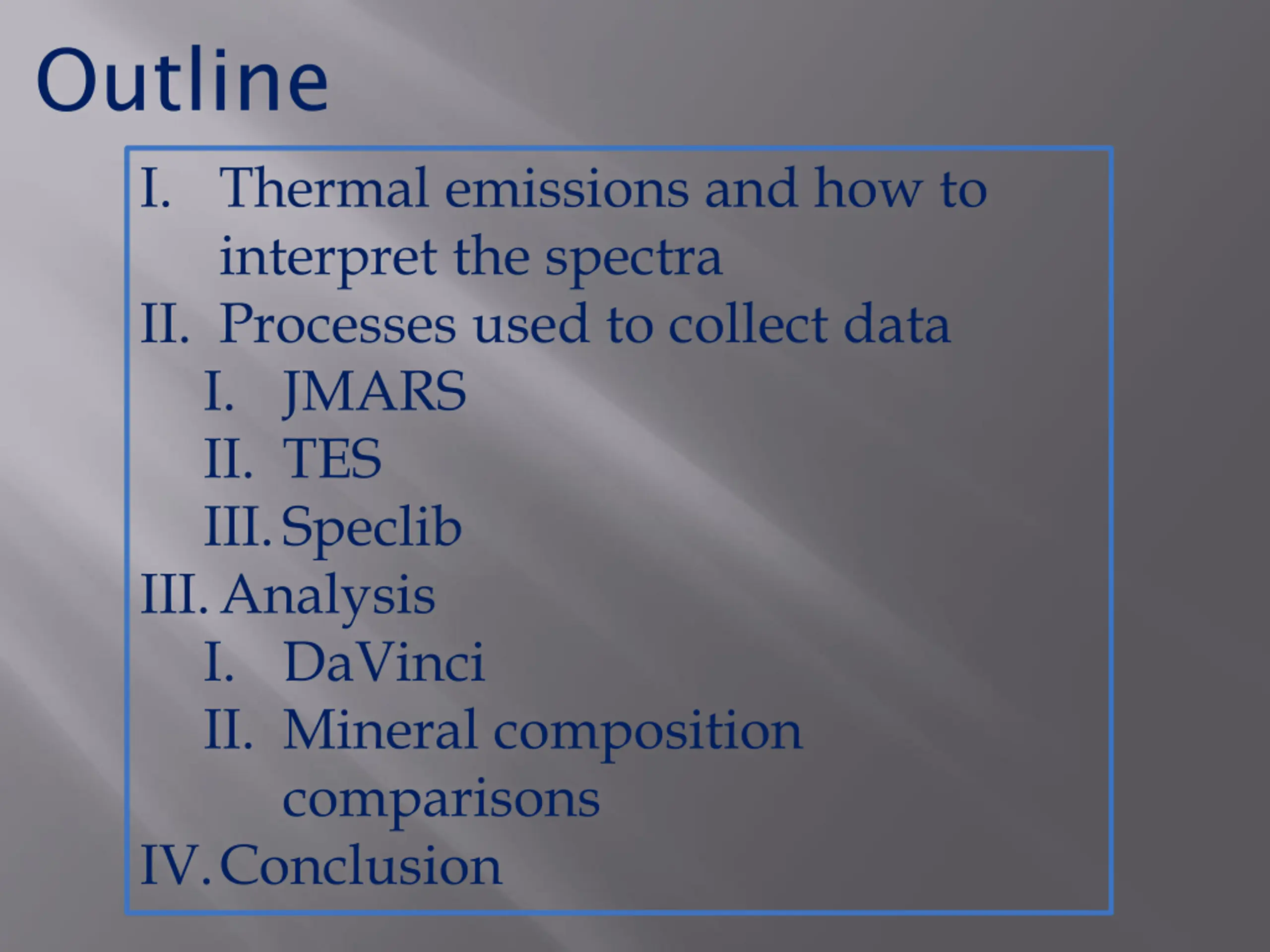 Outline I. Thermal emissions and how to interpret the spectra II. Processes used to collect data I. JMARS II. TES III.Speclib III.Analysis I. DaVinci II. Mineral composition comparisons IV.Conclusion