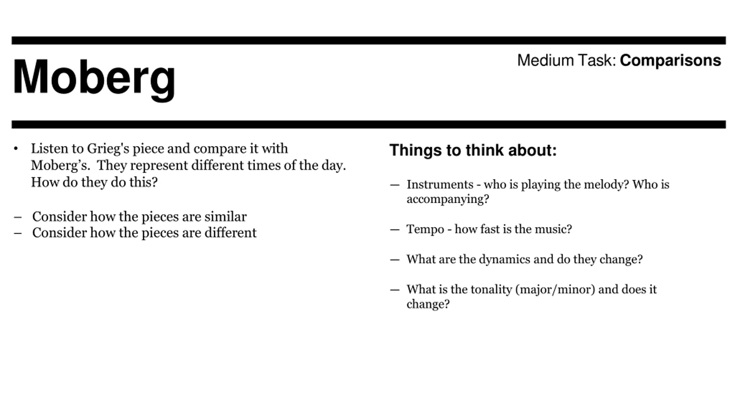 Moberg Medium Task: Comparisons Things to think about: Listen to Grieg's piece and compare it with Moberg s. They represent different times of the day. How do they do this? Instruments - who is playing the melody? Who is accompanying? Consider how the pieces are similar Consider how the pieces are different Tempo - how fast is the music? What are the dynamics and do they change? What is the tonality (major/minor) and does it change?