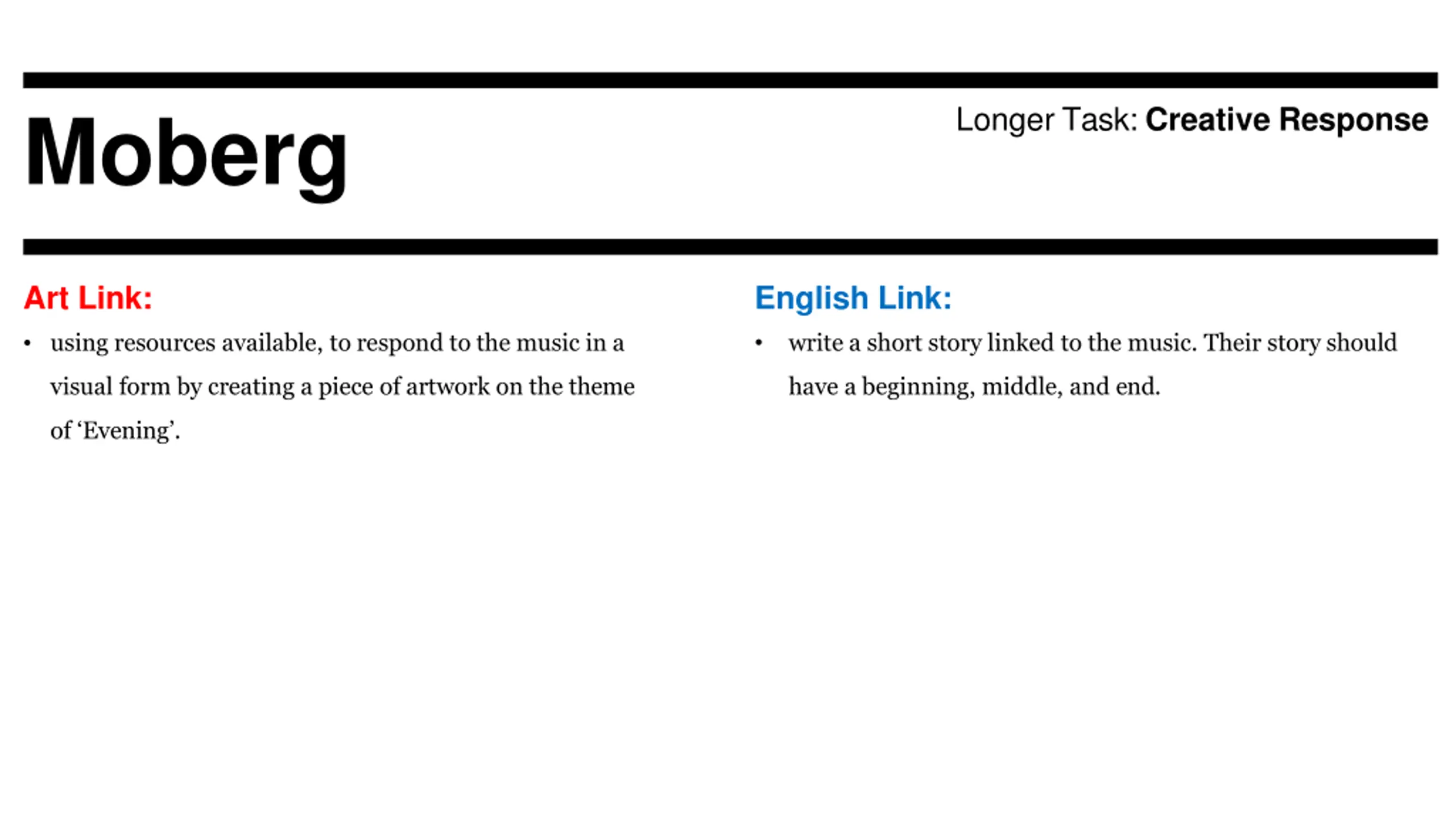 Moberg Longer Task: Creative Response Art Link: English Link: using resources available, to respond to the music in a write a short story linked to the music. Their story should visual form by creating a piece of artwork on the theme have a beginning, middle, and end. of Evening .