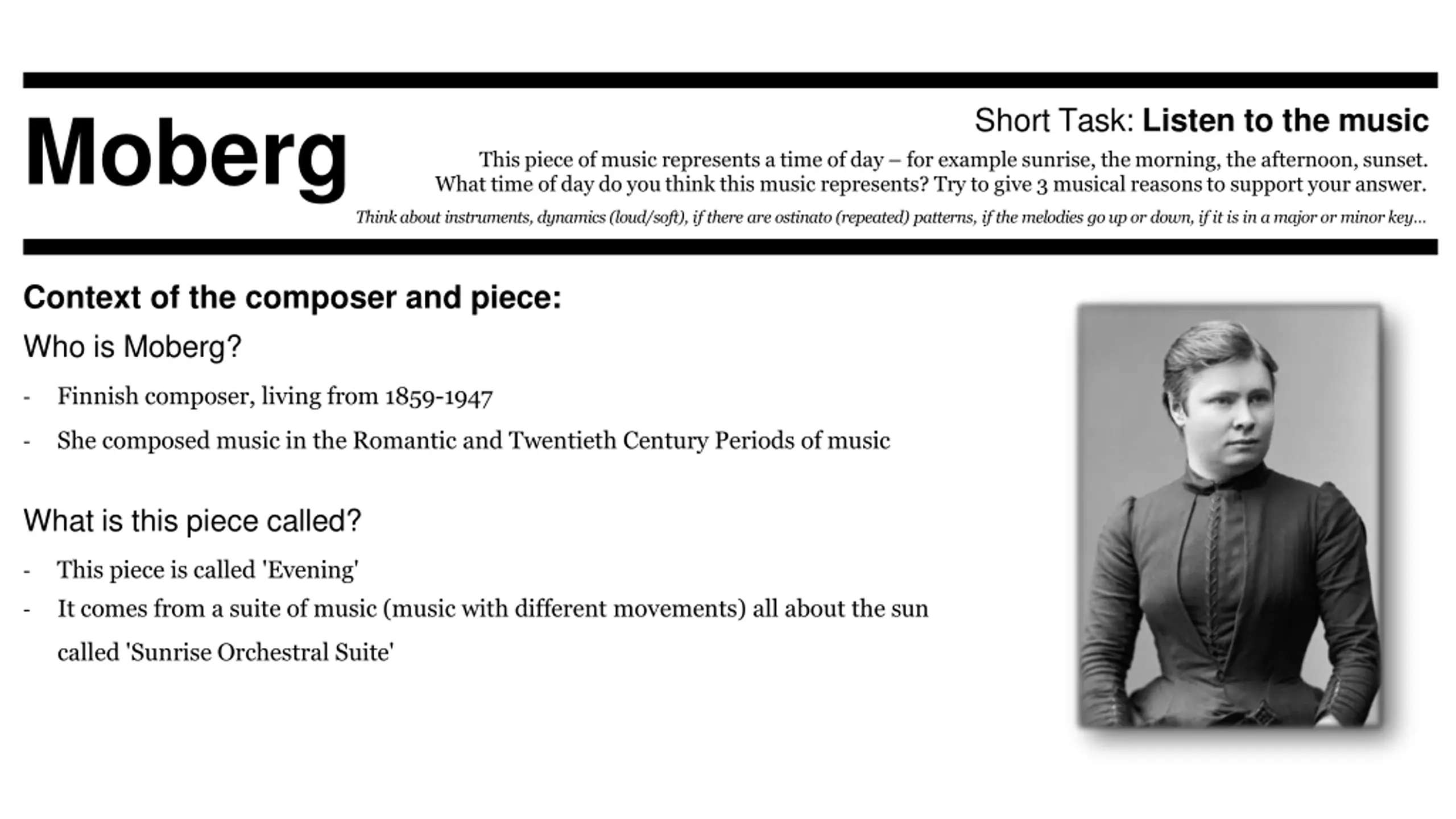 Moberg Short Task: Listen to the music This piece of music represents a time of day for example sunrise, the morning, the afternoon, sunset. What time of day do you think this music represents? Try to give 3 musical reasons to support your answer. Think about instruments, dynamics (loud/soft), if there are ostinato (repeated) patterns, if the melodies go up or down, if it is in a major or minor key... Context of the composer and piece: Who is Moberg? Finnish composer, living from 1859-1947 - She composed music in the Romantic and Twentieth Century Periods of music - What is this piece called? This piece is called 'Evening' It comes from a suite of music (music with different movements) all about the sun - - called 'Sunrise Orchestral Suite'