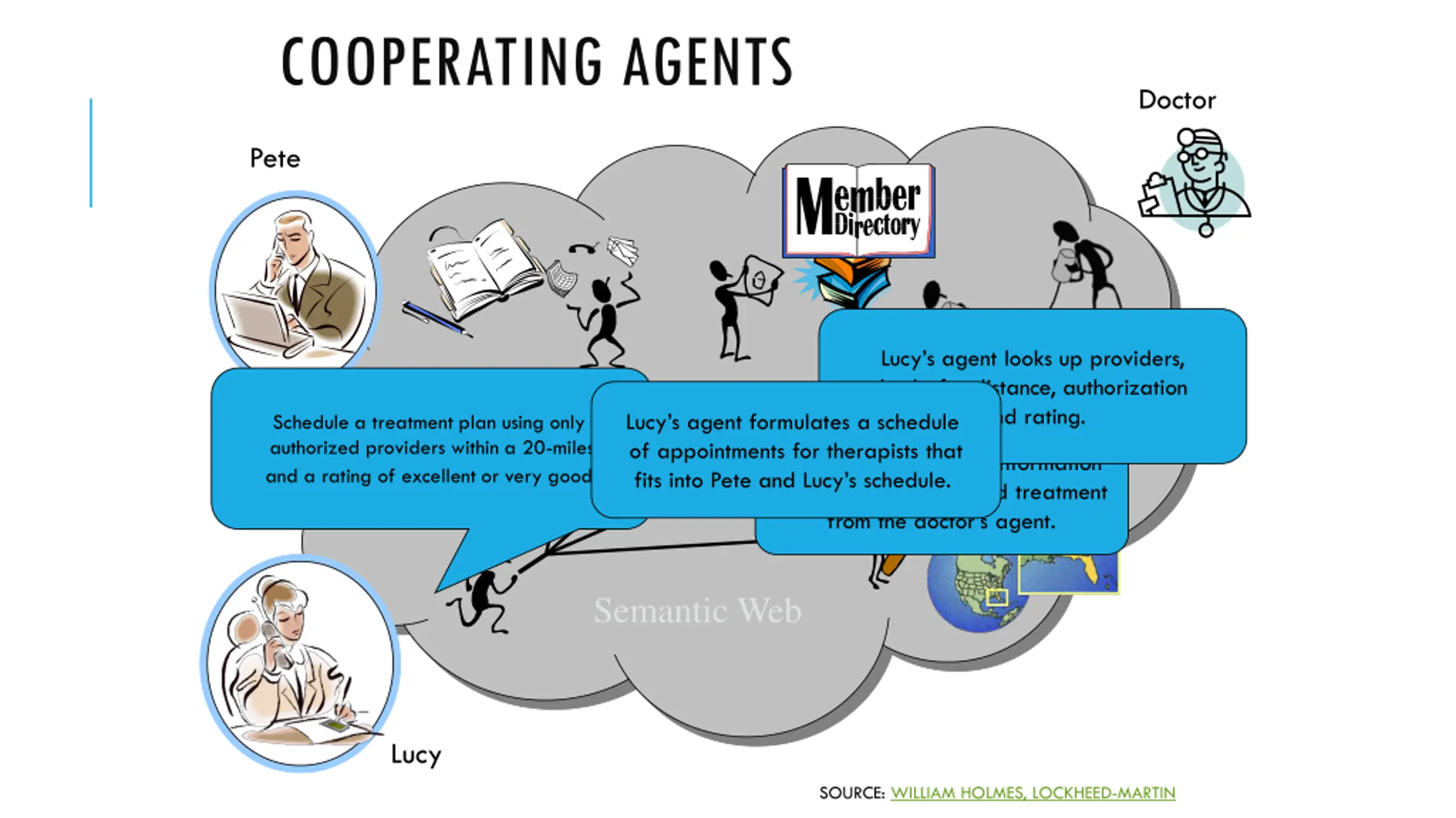 COOPERATING AGENTS Doctor Pete Lucy s agent looks up providers, checks for distance, authorization and rating. Lucy s agent formulates a schedule of appointments for therapists that fits into Pete and Lucy s schedule. Schedule a treatment plan using only authorized providers within a 20-miles and a rating of excellent or very good. Lucy s agent retrieves information about Mom s prescribed treatment from the doctor s agent. Semantic Web Lucy SOURCE: WILLIAM HOLMES, LOCKHEED-MARTIN