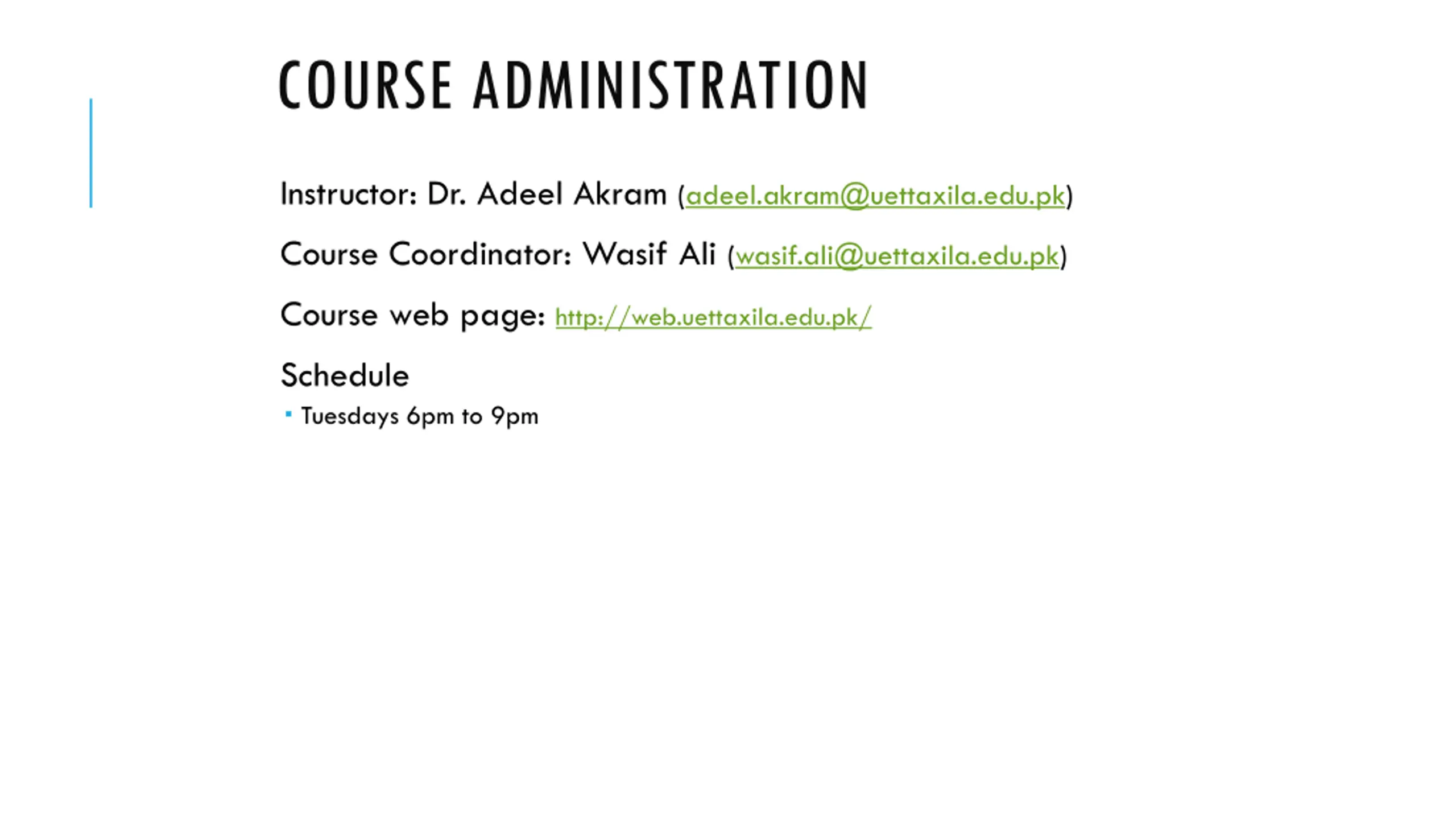 COURSE ADMINISTRATION Instructor: Dr. Adeel Akram (adeel.akram@uettaxila.edu.pk) Course Coordinator: Wasif Ali (wasif.ali@uettaxila.edu.pk) Course web page: http://web.uettaxila.edu.pk/ Schedule Tuesdays 6pm to 9pm