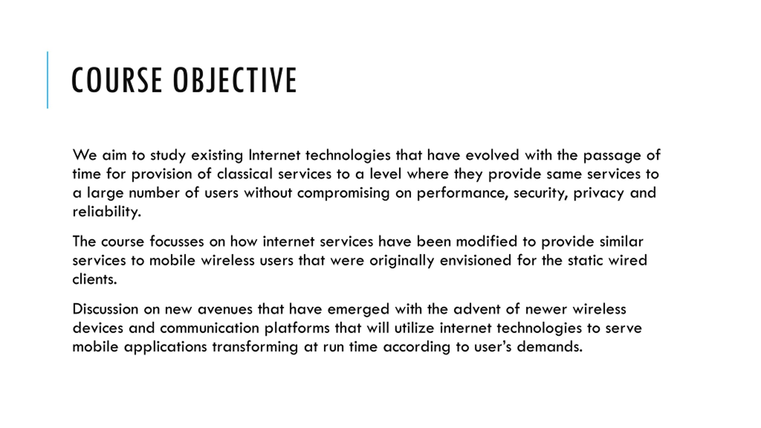 COURSE OBJECTIVE We aim to study existing Internet technologies that have evolved with the passage of time for provision of classical services to a level where they provide same services to a large number of users without compromising on performance, security, privacy and reliability. The course focusses on how internet services have been modified to provide similar services to mobile wireless users that were originally envisioned for the static wired clients. Discussion on new avenues that have emerged with the advent of newer wireless devices and communication platforms that will utilize internet technologies to serve mobile applications transforming at run time according to user s demands.