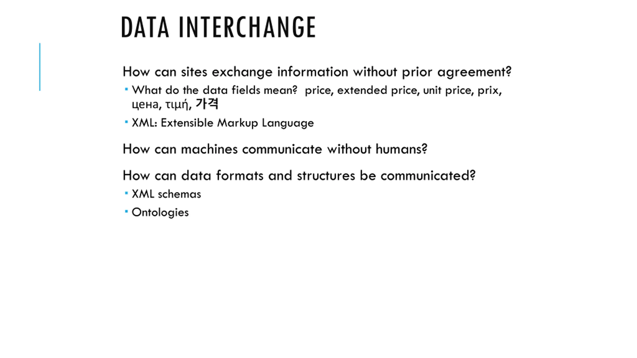 DATA INTERCHANGE How can sites exchange information without prior agreement? What do the data fields mean? price, extended price, unit price, prix, , , XML: Extensible Markup Language How can machines communicate without humans? How can data formats and structures be communicated? XML schemas Ontologies