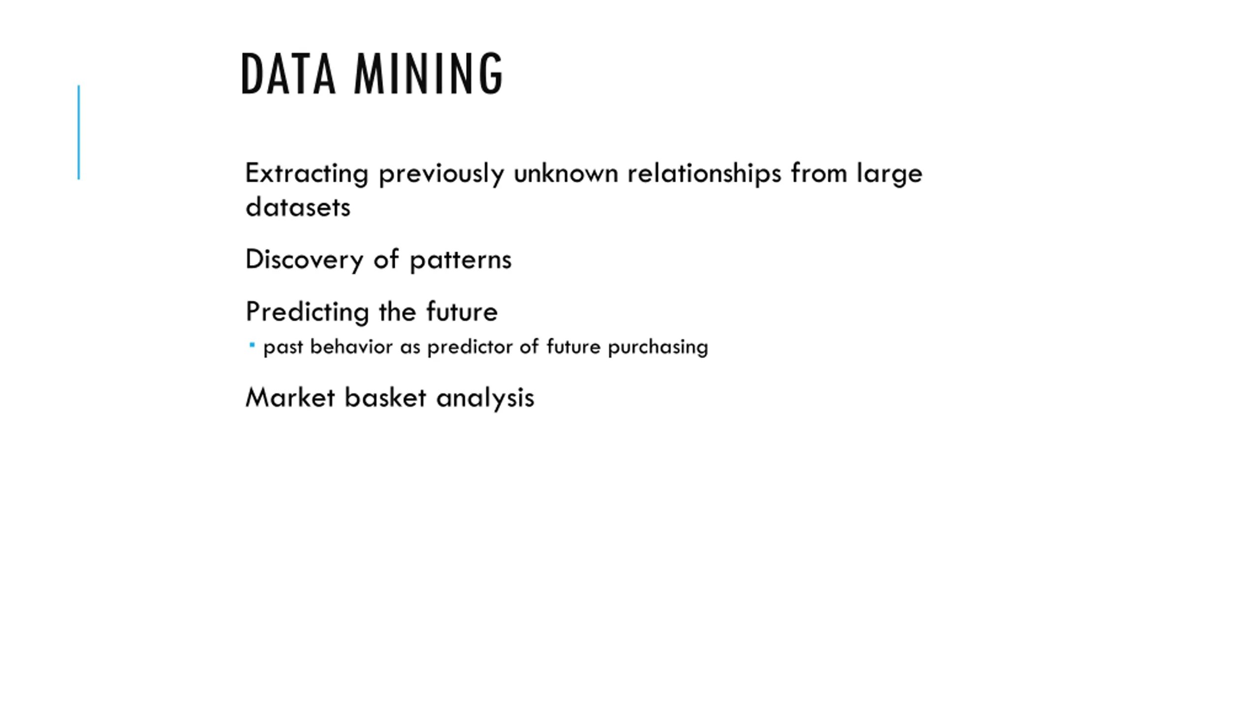 DATA MINING Extracting previously unknown relationships from large datasets Discovery of patterns Predicting the future past behavior as predictor of future purchasing Market basket analysis