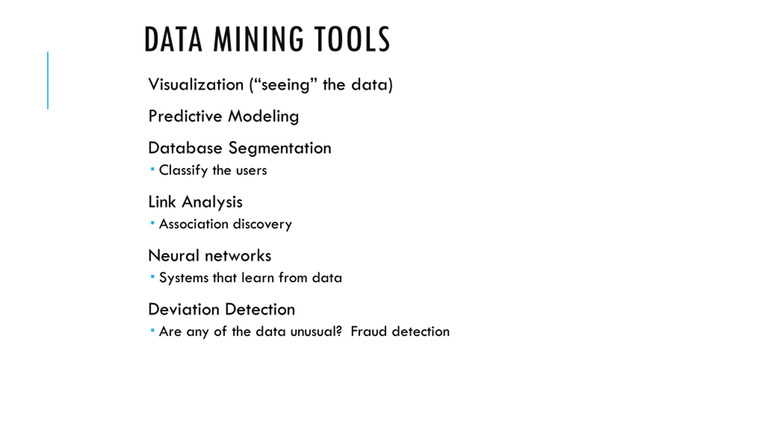 DATA MINING TOOLS Visualization ( seeing the data) Predictive Modeling Database Segmentation Classify the users Link Analysis Association discovery Neural networks Systems that learn from data Deviation Detection Are any of the data unusual? Fraud detection