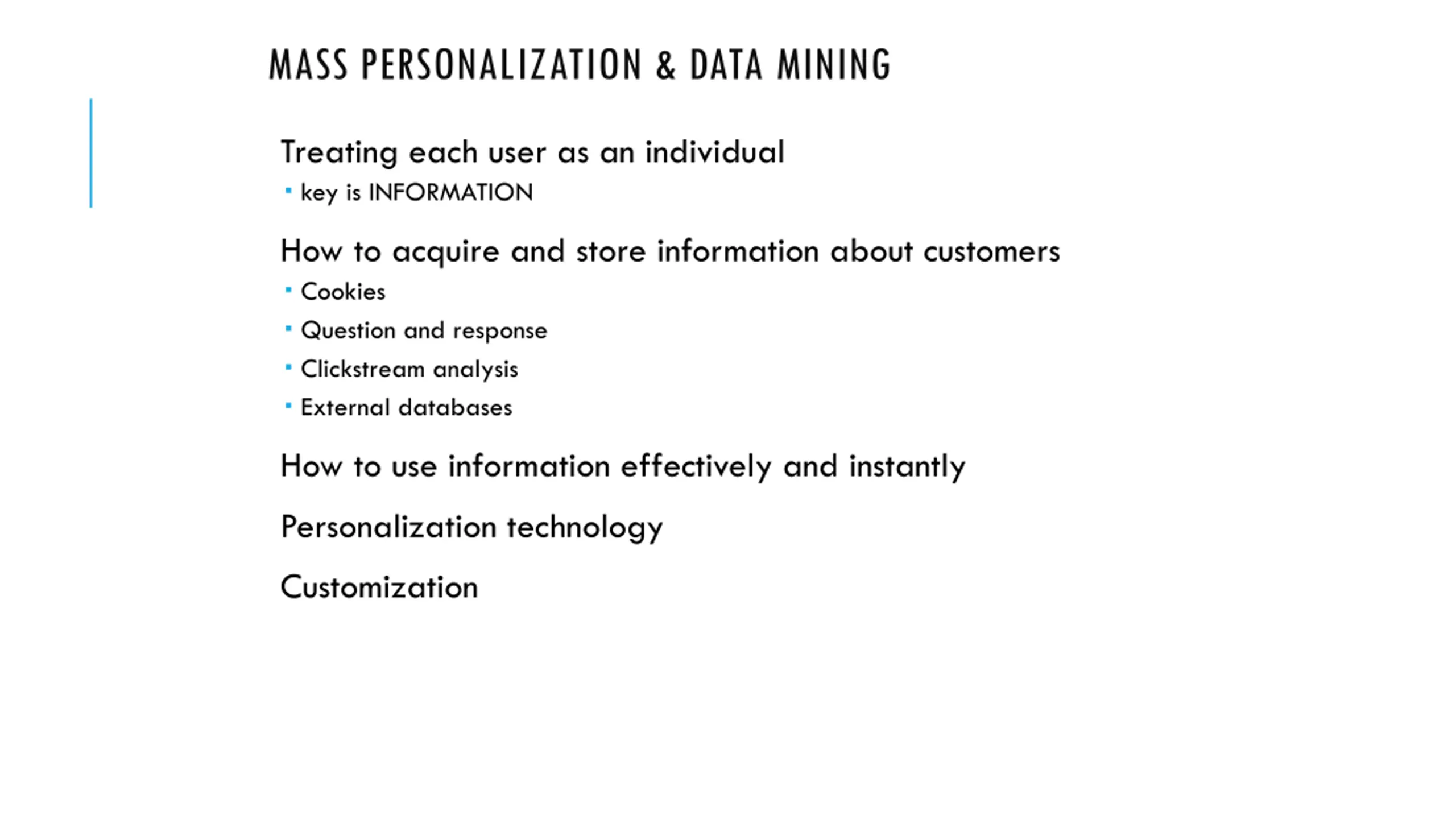 MASS PERSONALIZATION & DATA MINING Treating each user as an individual key is INFORMATION How to acquire and store information about customers Cookies Question and response Clickstream analysis External databases How to use information effectively and instantly Personalization technology Customization