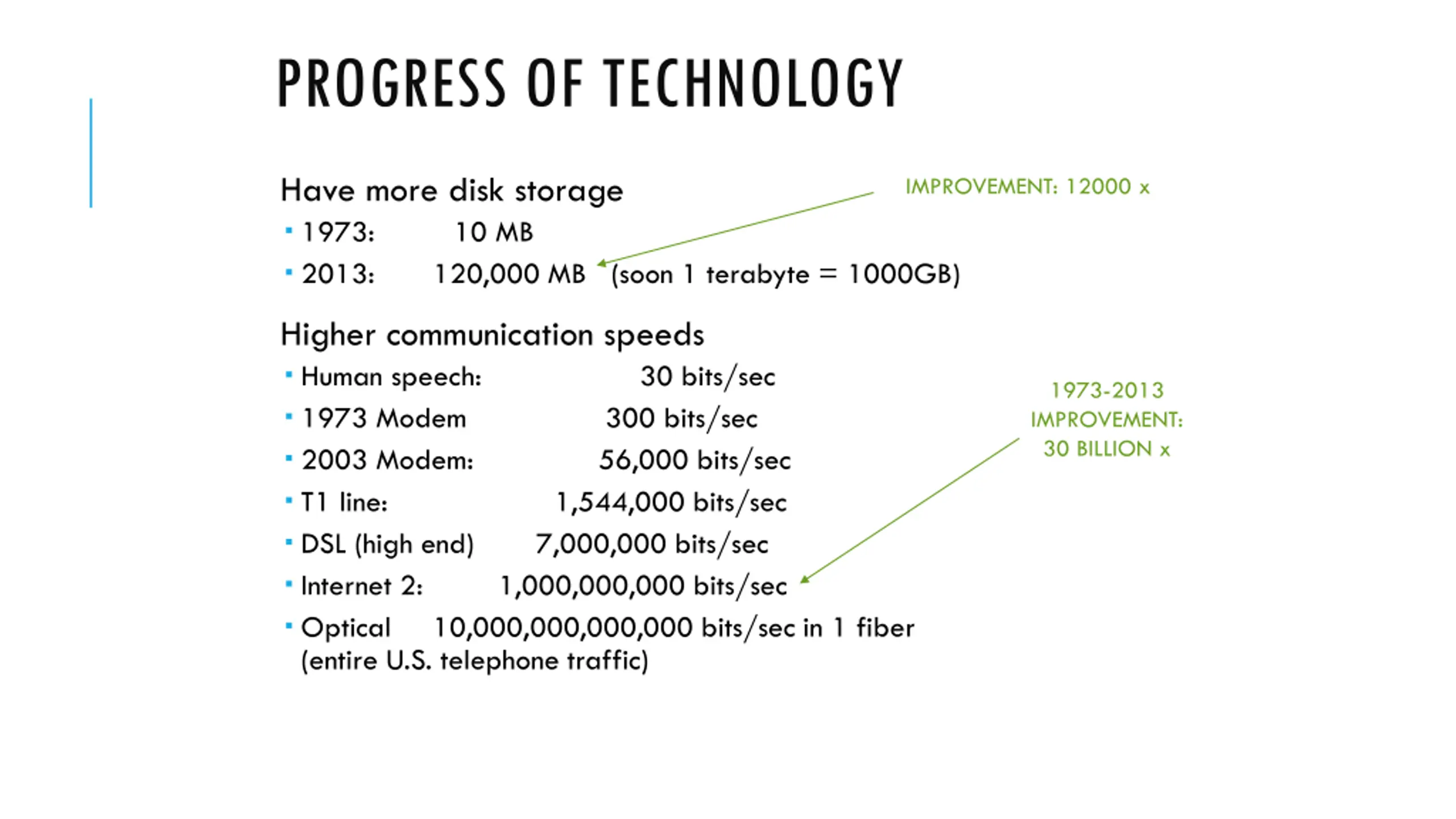 PROGRESS OF TECHNOLOGY Have more disk storage 1973: 10 MB 2013: 120,000 MB (soon 1 terabyte = 1000GB) IMPROVEMENT: 12000 x Higher communication speeds Human speech: 30 bits/sec 1973 Modem 2003 Modem: 56,000 bits/sec T1 line: 1,544,000 bits/sec DSL (high end) Internet 2: 1,000,000,000 bits/sec Optical 10,000,000,000,000 bits/sec in 1 fiber (entire U.S. telephone traffic) 1973-2013 IMPROVEMENT: 30 BILLION x 300 bits/sec 7,000,000 bits/sec