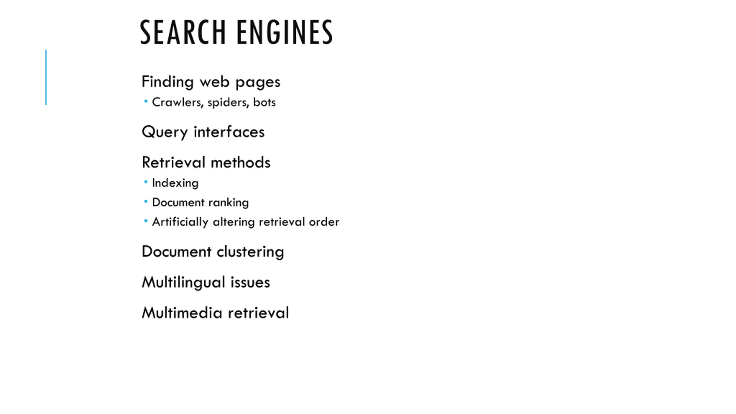 SEARCH ENGINES Finding web pages Crawlers, spiders, bots Query interfaces Retrieval methods Indexing Document ranking Artificially altering retrieval order Document clustering Multilingual issues Multimedia retrieval