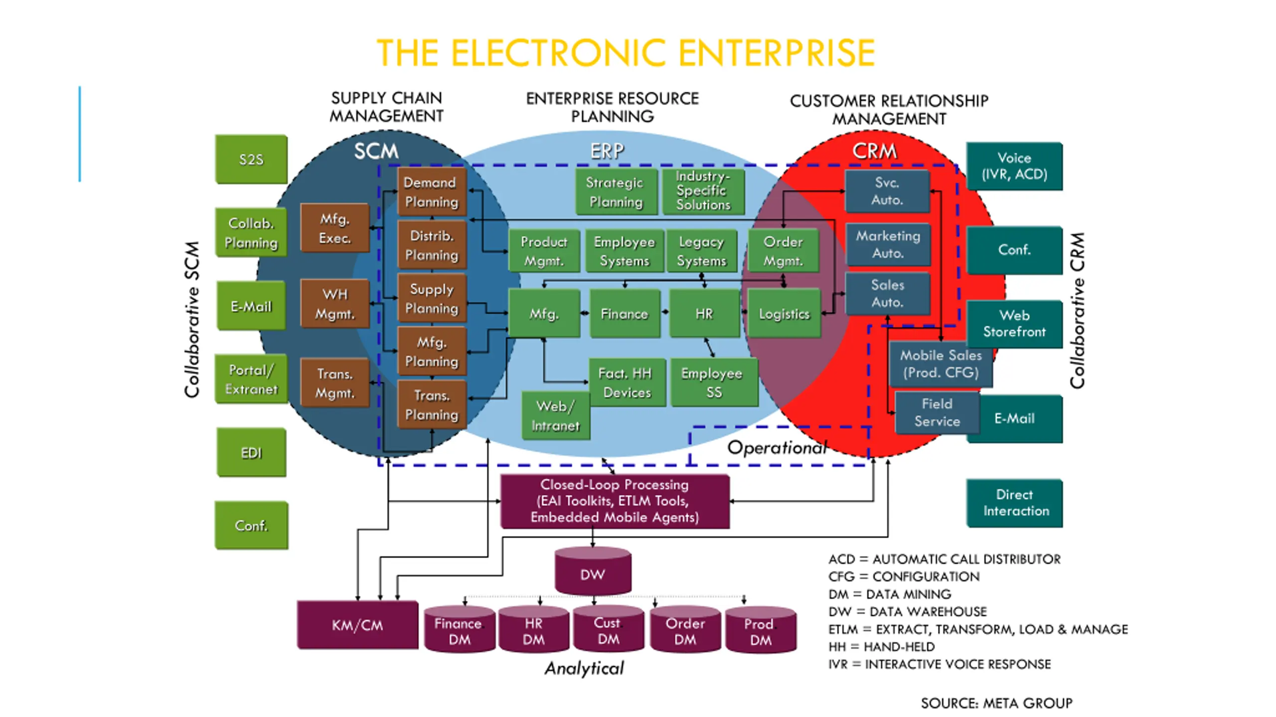 THE ELECTRONIC ENTERPRISE SUPPLY CHAIN MANAGEMENT ENTERPRISE RESOURCE PLANNING CUSTOMER RELATIONSHIP MANAGEMENT SCM ERP CRM Voice (IVR, ACD) S2S Industry- Specific Solutions Strategic Planning Svc. Auto. Demand Planning Mfg. Exec. Collab. Planning Distrib. Planning Marketing Auto. Collaborative CRM Legacy Systems Product Mgmt. Employee Systems Order Mgmt. Conf. Collaborative SCM Sales Auto. Supply Planning WH Mgmt. E-Mail Mfg. HR Finance Logistics Web Storefront Mfg. Planning Mobile Sales (Prod. CFG) Portal/ Extranet Fact. HH Devices Employee SS Trans. Mgmt. Trans. Planning Field Service Web/ Intranet E-Mail Operational EDI Closed-Loop Processing (EAI Toolkits, ETLM Tools, Embedded Mobile Agents) Direct Interaction Conf. ACD = AUTOMATIC CALL DISTRIBUTOR CFG = CONFIGURATION DM = DATA MINING DW = DATA WAREHOUSE ETLM = EXTRACT, TRANSFORM, LOAD & MANAGE HH = HAND-HELD IVR = INTERACTIVE VOICE RESPONSE DW Cust. DM Finance. DM HR DM Order DM Prod. DM KM/CM Analytical SOURCE: META GROUP