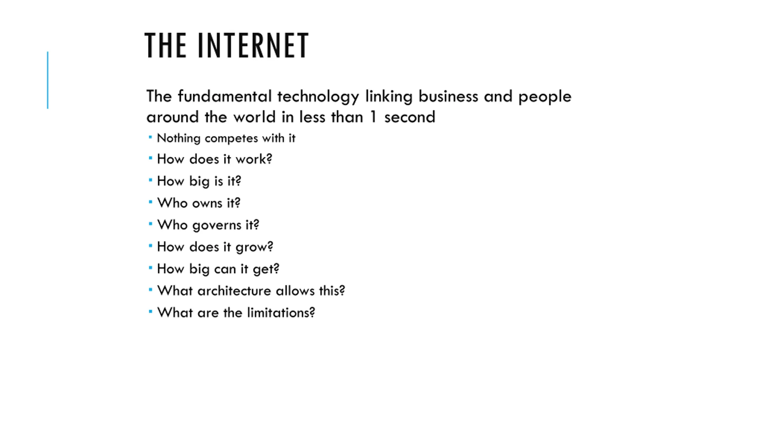THE INTERNET The fundamental technology linking business and people around the world in less than 1 second Nothing competes with it How does it work? How big is it? Who owns it? Who governs it? How does it grow? How big can it get? What architecture allows this? What are the limitations?