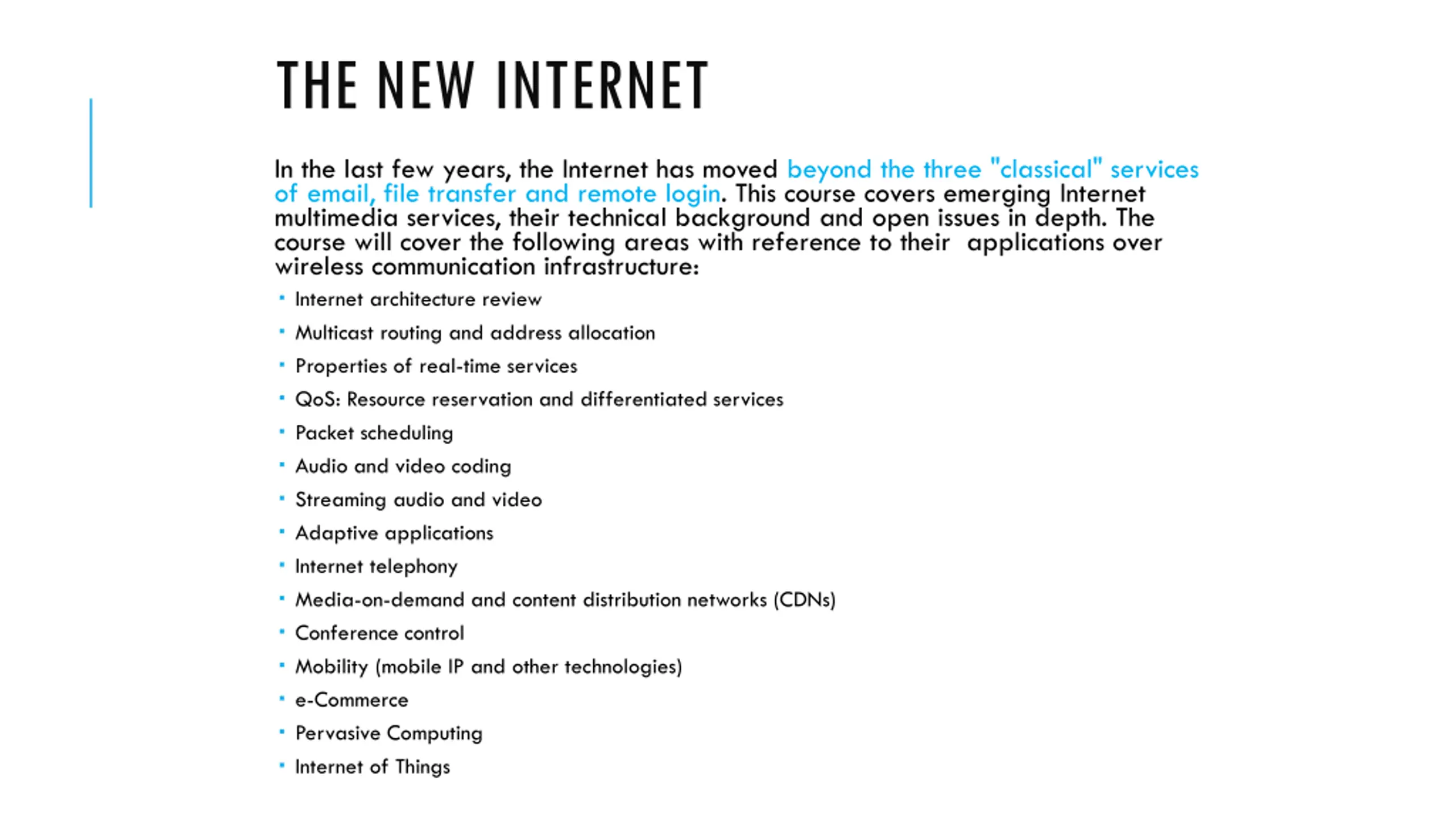 THE NEW INTERNET In the last few years, the Internet has moved beyond the three "classical" services of email, file transfer and remote login. This course covers emerging Internet multimedia services, their technical background and open issues in depth. The course will cover the following areas with reference to their applications over wireless communication infrastructure: Internet architecture review Multicast routing and address allocation Properties of real-time services QoS: Resource reservation and differentiated services Packet scheduling Audio and video coding Streaming audio and video Adaptive applications Internet telephony Media-on-demand and content distribution networks (CDNs) Conference control Mobility (mobile IP and other technologies) e-Commerce Pervasive Computing Internet of Things