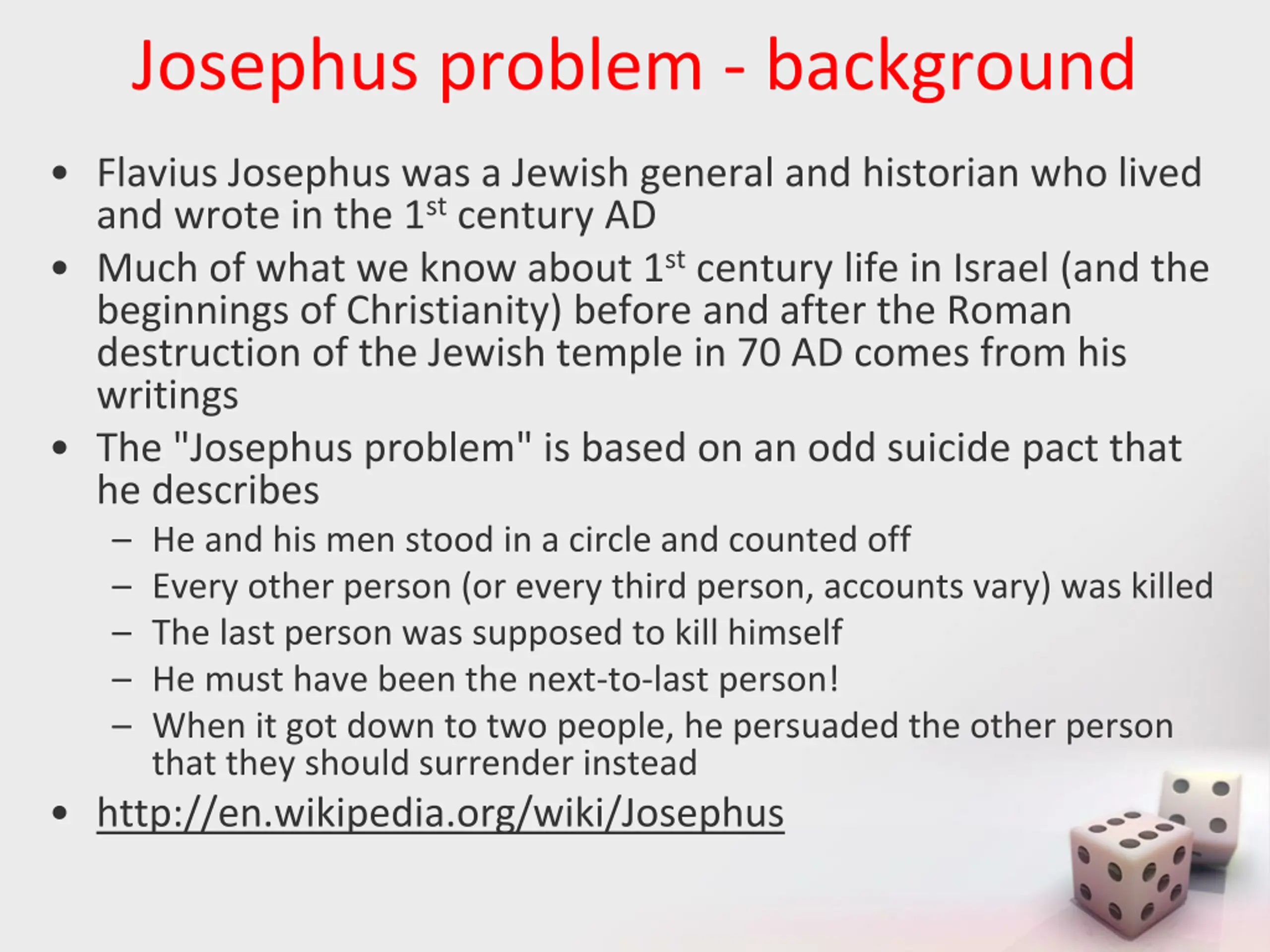 Josephus problem - background Flavius Josephus was a Jewish general and historian who lived and wrote in the 1st century AD Much of what we know about 1st century life in Israel (and the beginnings of Christianity) before and after the Roman destruction of the Jewish temple in 70 AD comes from his writings The "Josephus problem" is based on an odd suicide pact that he describes He and his men stood in a circle and counted off Every other person (or every third person, accounts vary) was killed The last person was supposed to kill himself He must have been the next-to-last person! When it got down to two people, he persuaded the other person that they should surrender instead http://en.wikipedia.org/wiki/Josephus