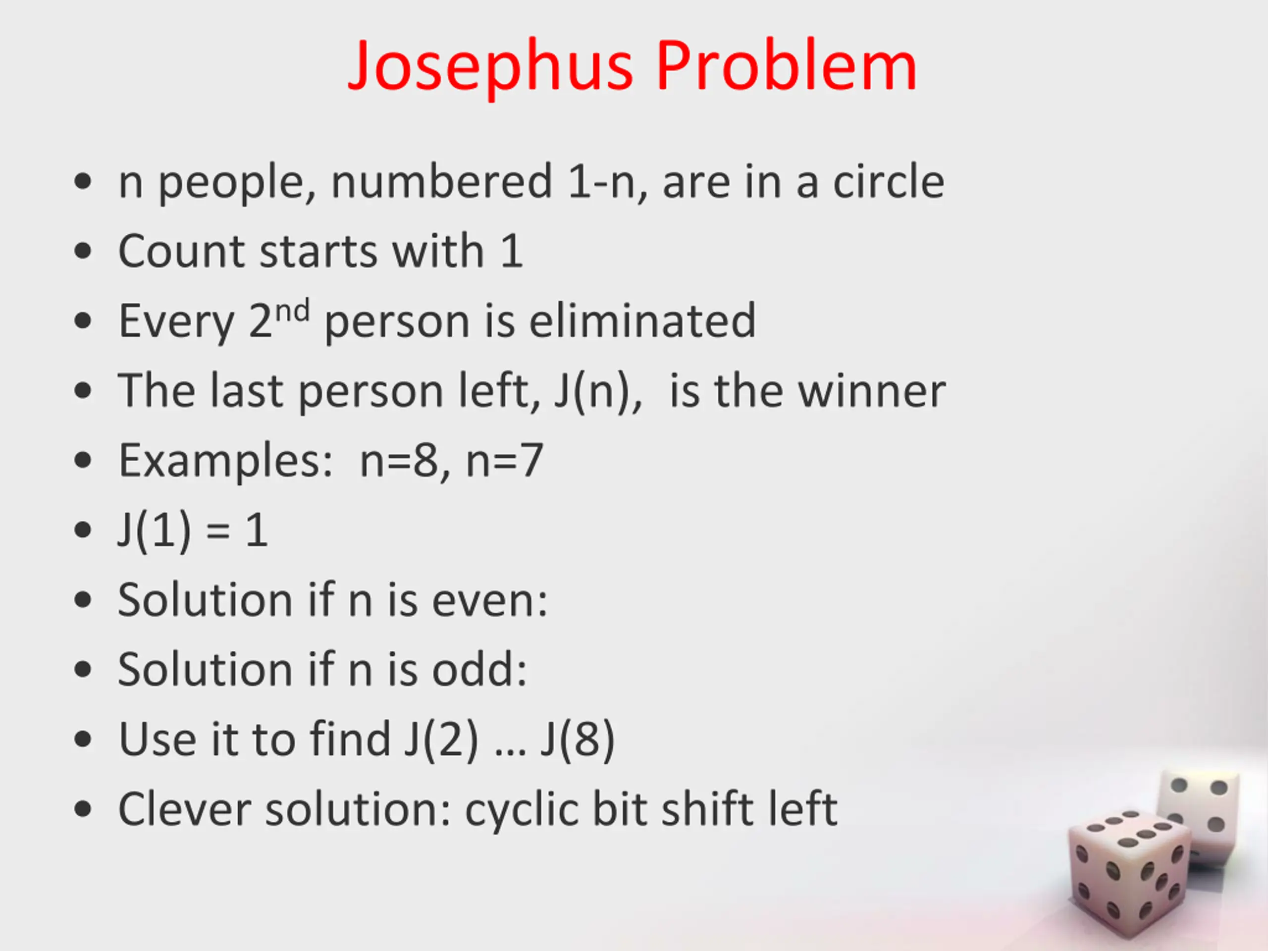 Josephus Problem n people, numbered 1-n, are in a circle Count starts with 1 Every 2nd person is eliminated The last person left, J(n), is the winner Examples: n=8, n=7 J(1) = 1 Solution if n is even: Solution if n is odd: Use it to find J(2) J(8) Clever solution: cyclic bit shift left