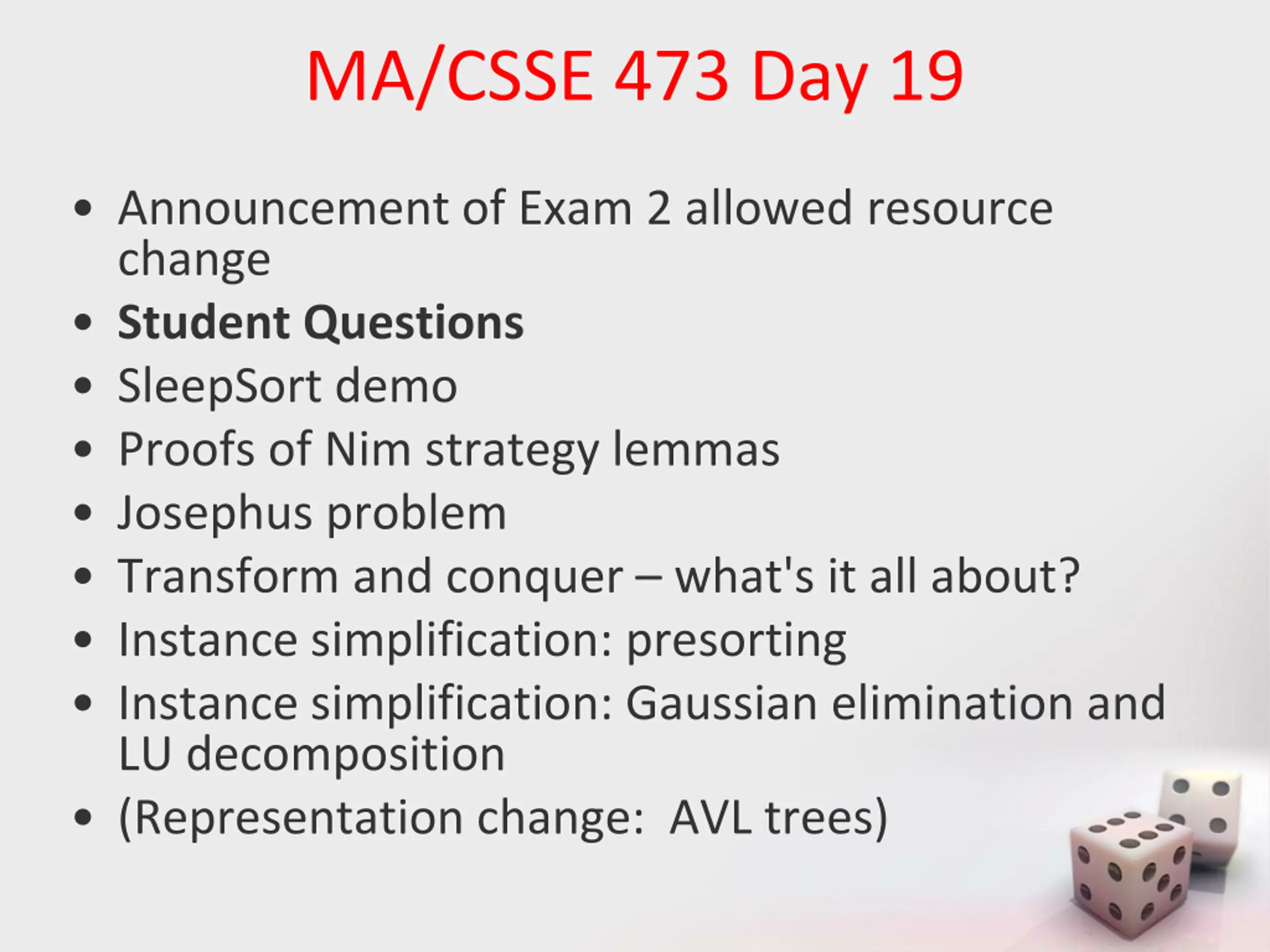 MA/CSSE 473 Day 19 Sleepsort Finish Nim Josephus problem Transform and conquer examples