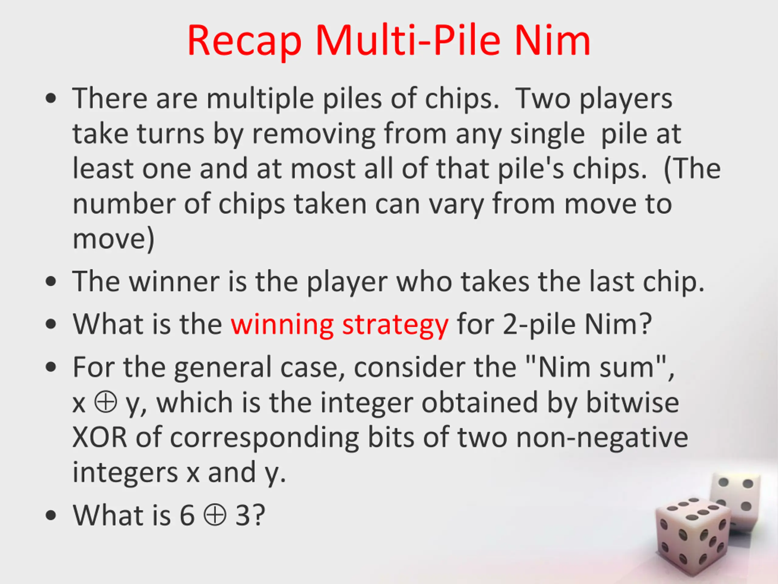 Recap Multi-Pile Nim There are multiple piles of chips. Two players take turns by removing from any single pile at least one and at most all of that pile's chips. (The number of chips taken can vary from move to move) The winner is the player who takes the last chip. What is the winning strategy for 2-pile Nim? For the general case, consider the "Nim sum", x y, which is the integer obtained by bitwise XOR of corresponding bits of two non-negative integers x and y. What is 6 3?