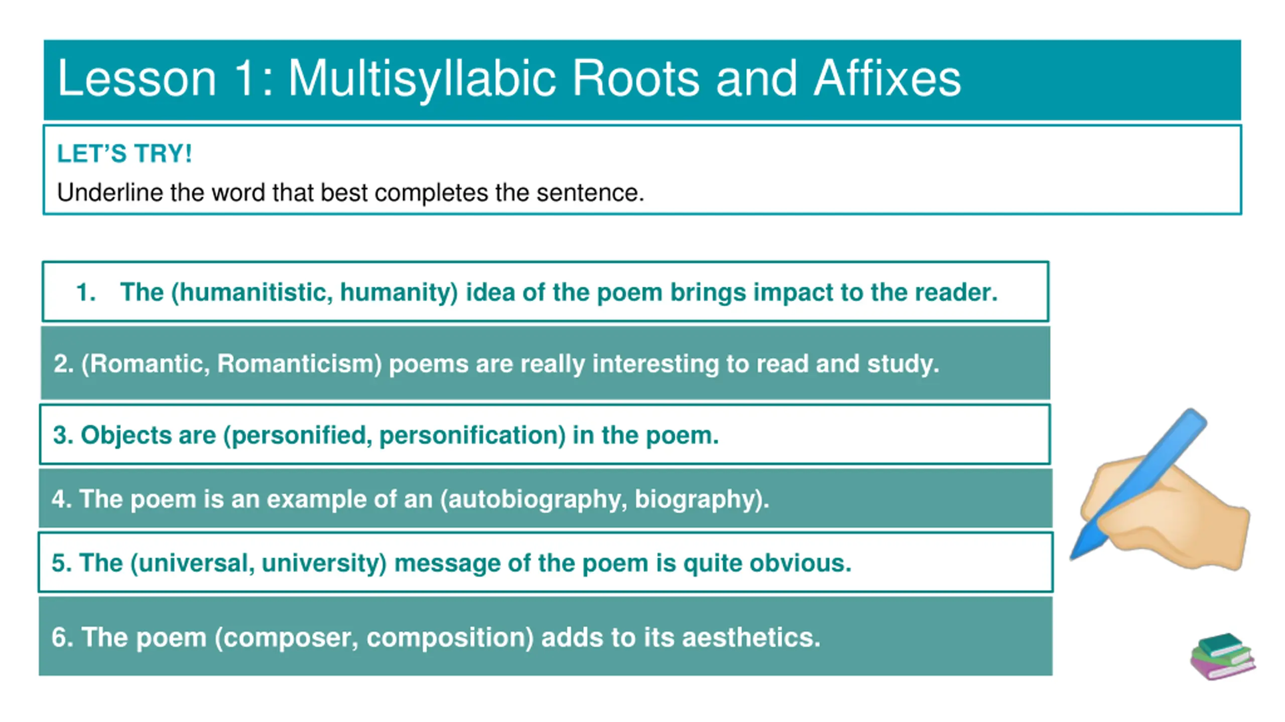 Lesson 1: Multisyllabic Roots and Affixes LET S TRY! Underline the word that best completes the sentence. 1. The (humanitistic, humanity) idea of the poem brings impact to the reader. 2. (Romantic, Romanticism) poems are really interesting to read and study. 3. Objects are (personified, personification) in the poem. 4. The poem is an example of an (autobiography, biography). 5. The (universal, university) message of the poem is quite obvious. 6. The poem (composer, composition) adds to its aesthetics.