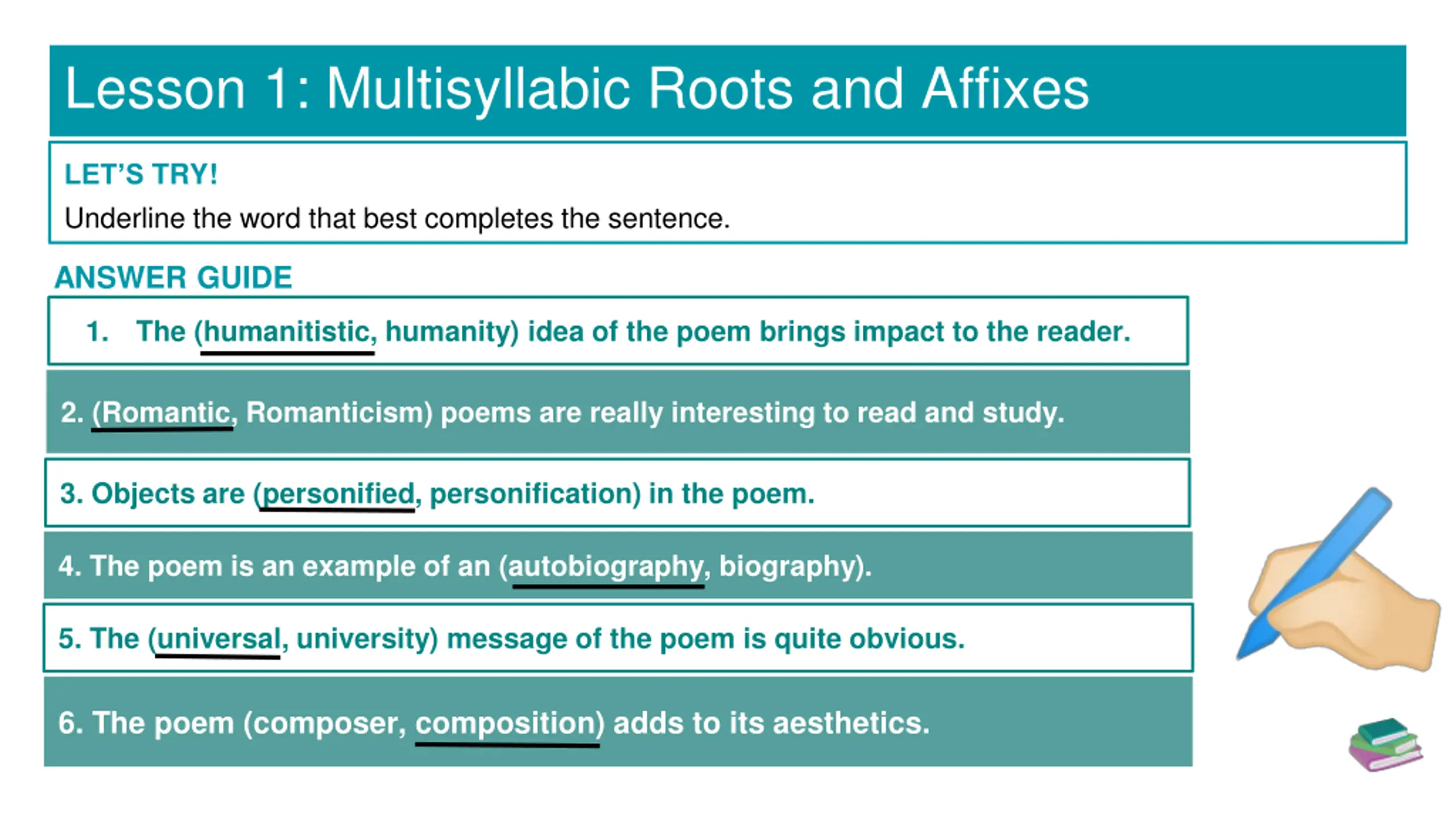 Lesson 1: Multisyllabic Roots and Affixes LET S TRY! Underline the word that best completes the sentence. ANSWER GUIDE 1. The (humanitistic, humanity) idea of the poem brings impact to the reader. 2. (Romantic, Romanticism) poems are really interesting to read and study. 3. Objects are (personified, personification) in the poem. 4. The poem is an example of an (autobiography, biography). 5. The (universal, university) message of the poem is quite obvious. 6. The poem (composer, composition) adds to its aesthetics.