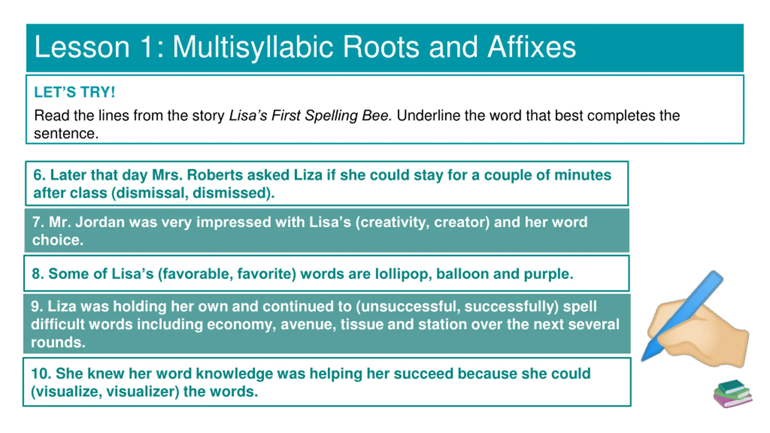 Lesson 1: Multisyllabic Roots and Affixes LET S TRY! Read the lines from the story Lisa s First Spelling Bee. Underline the word that best completes the sentence. 6. Later that day Mrs. Roberts asked Liza if she could stay for a couple of minutes after class (dismissal, dismissed). 7. Mr. Jordan was very impressed with Lisa s (creativity, creator) and her word choice. 8. Some of Lisa s (favorable, favorite) words are lollipop, balloon and purple. 9. Liza was holding her own and continued to (unsuccessful, successfully) spell difficult words including economy, avenue, tissue and station over the next several rounds. 10. She knew her word knowledge was helping her succeed because she could (visualize, visualizer) the words.