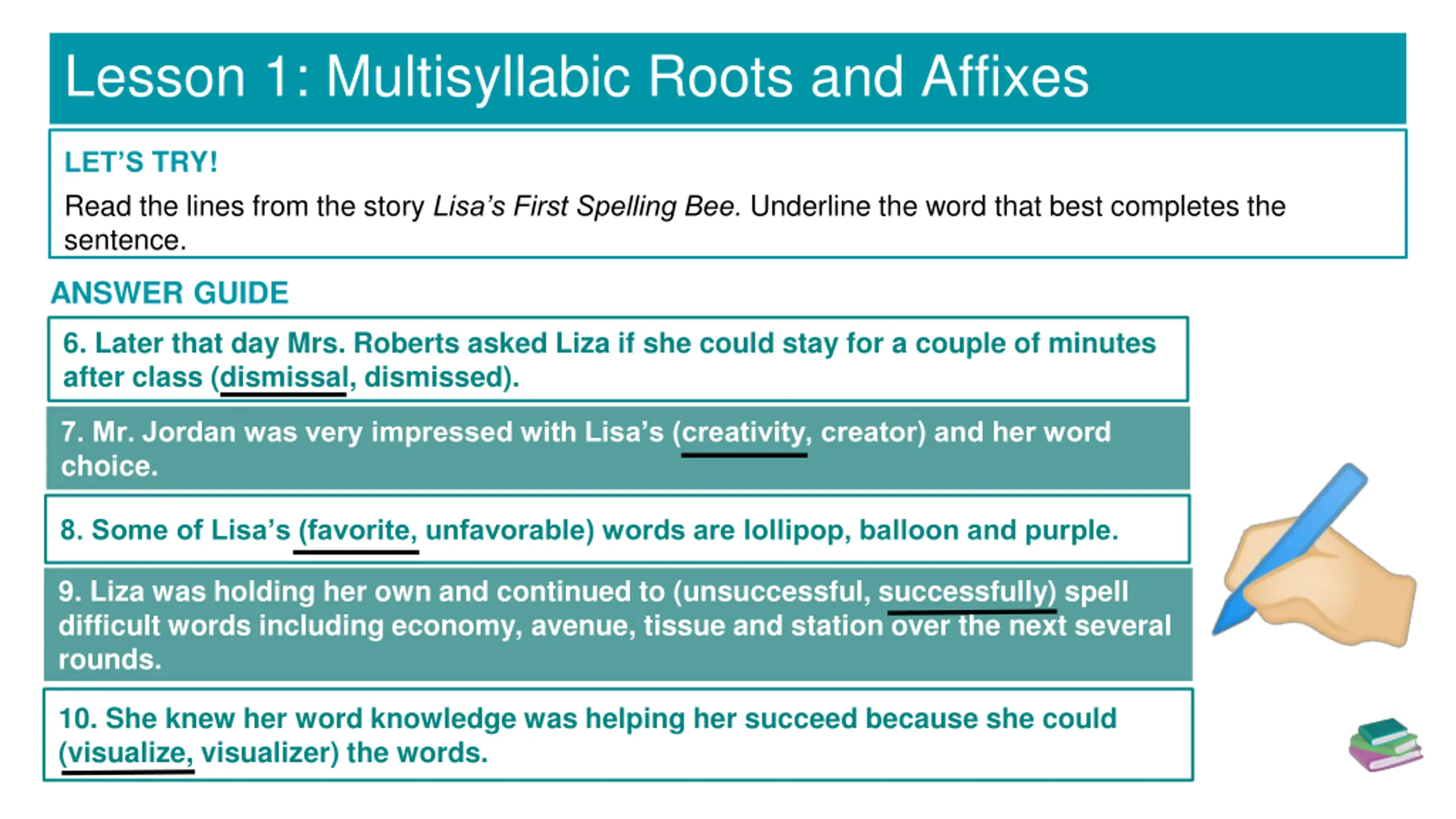 Lesson 1: Multisyllabic Roots and Affixes LET S TRY! Read the lines from the story Lisa s First Spelling Bee. Underline the word that best completes the sentence. ANSWER GUIDE 6. Later that day Mrs. Roberts asked Liza if she could stay for a couple of minutes after class (dismissal, dismissed). 7. Mr. Jordan was very impressed with Lisa s (creativity, creator) and her word choice. 8. Some of Lisa s (favorite, unfavorable) words are lollipop, balloon and purple. 9. Liza was holding her own and continued to (unsuccessful, successfully) spell difficult words including economy, avenue, tissue and station over the next several rounds. 10. She knew her word knowledge was helping her succeed because she could (visualize, visualizer) the words.