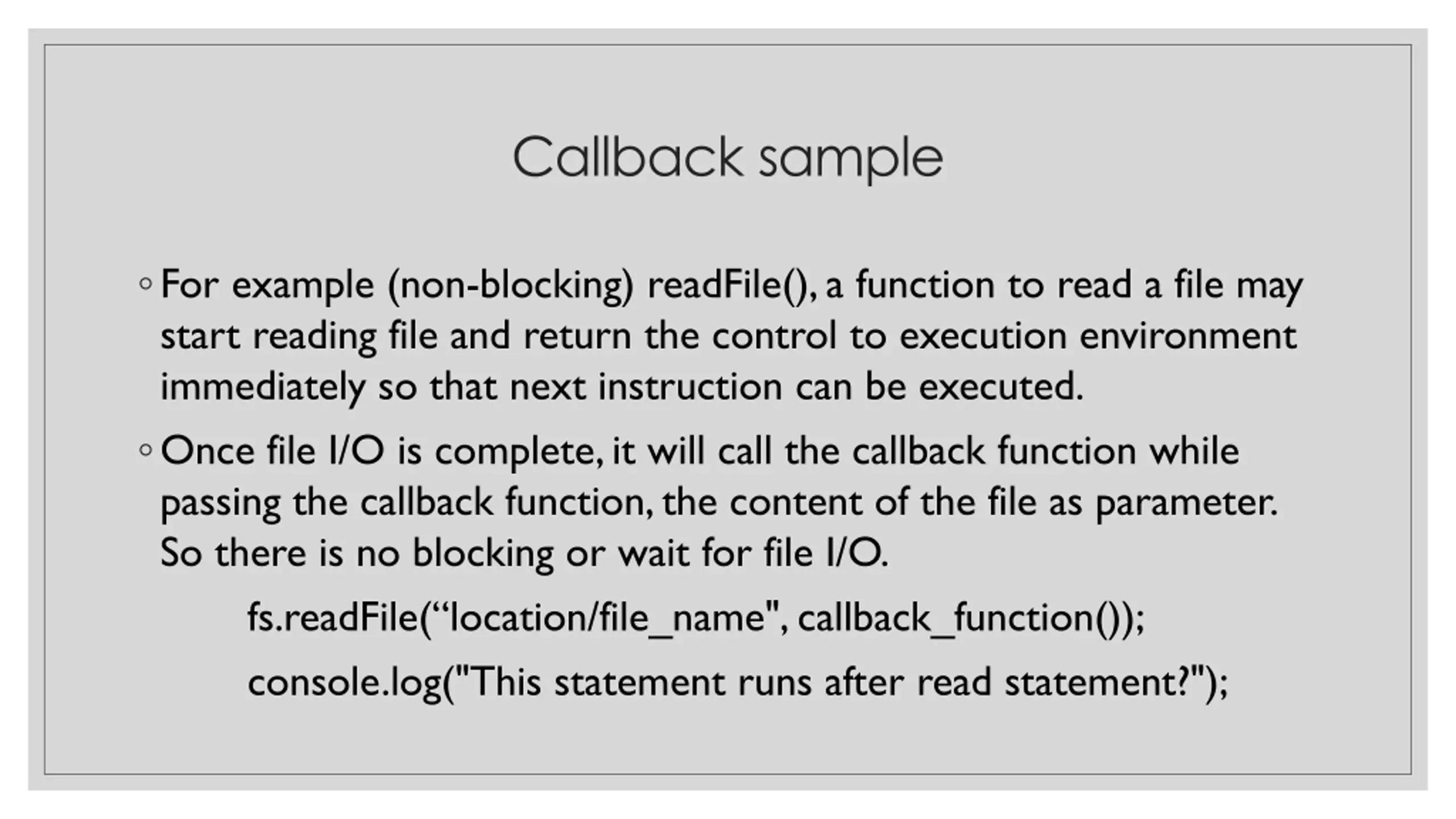 Callback sample For example (non-blocking) readFile(), a function to read a file may start reading file and return the control to execution environment immediately so that next instruction can be executed. Once file I/O is complete, it will call the callback function while passing the callback function, the content of the file as parameter. So there is no blocking or wait for file I/O. fs.readFile( location/file_name", callback_function()); console.log("This statement runs after read statement?");