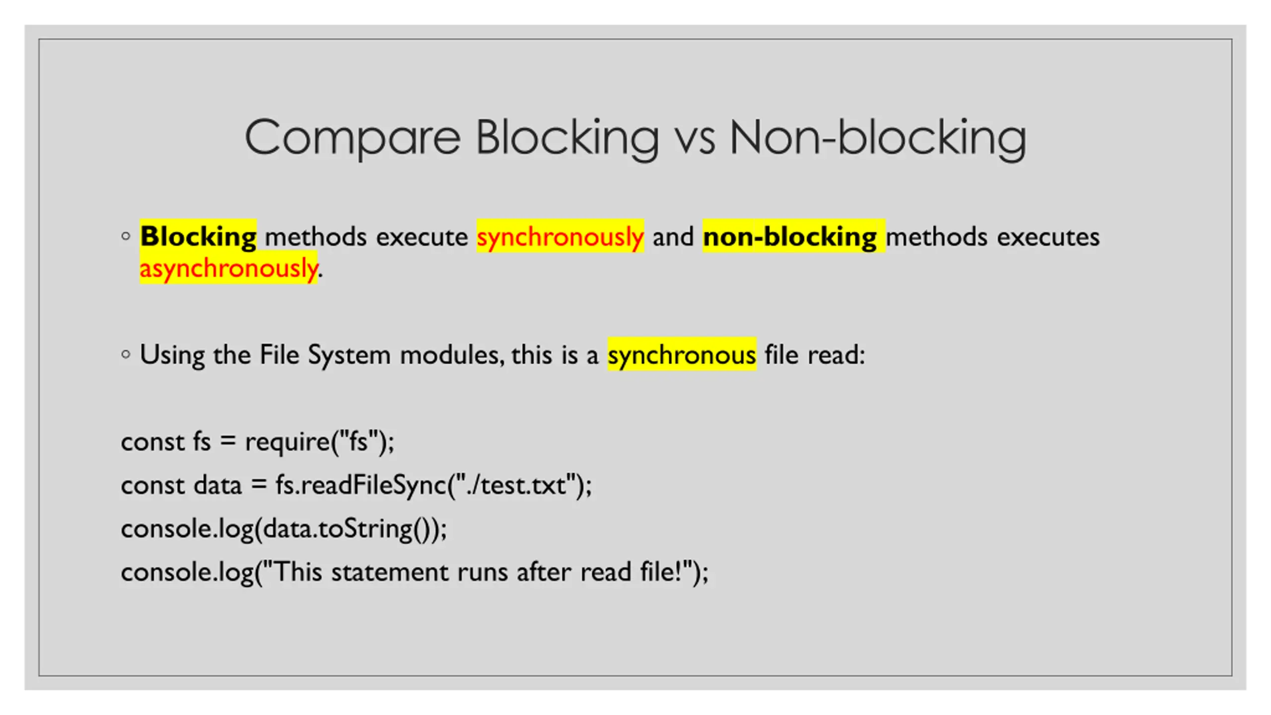 Compare Blocking vs Non-blocking Blocking methods execute synchronously and non-blocking methods executes asynchronously. Using the File System modules, this is a synchronous file read: const fs = require("fs"); const data = fs.readFileSync("./test.txt"); console.log(data.toString()); console.log("This statement runs after read file!");