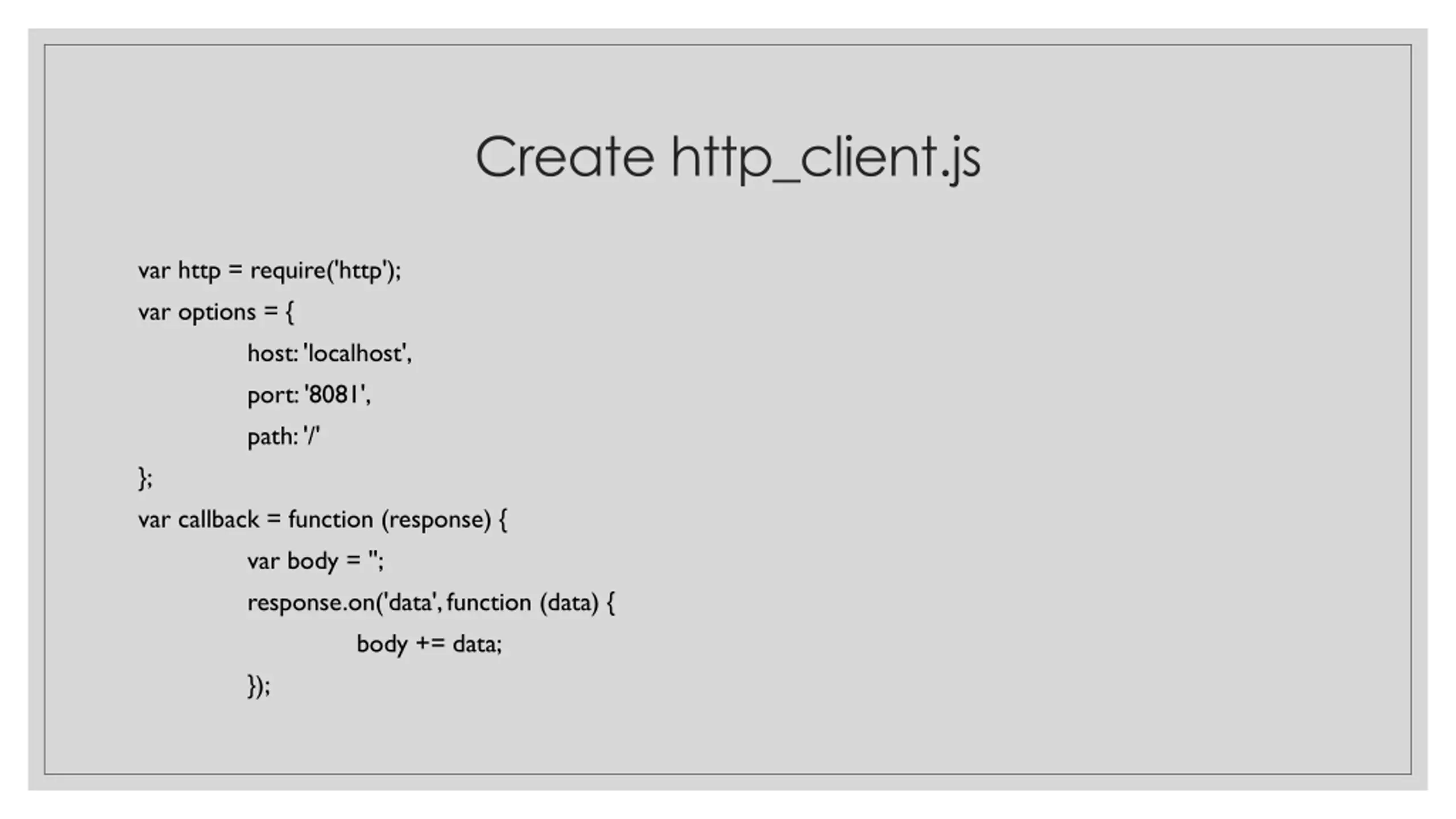 Create http_client.js var http = require('http'); var options = { host: 'localhost', port: '8081', path: '/' }; var callback = function (response) { var body = ''; response.on('data', function (data) { body += data; });