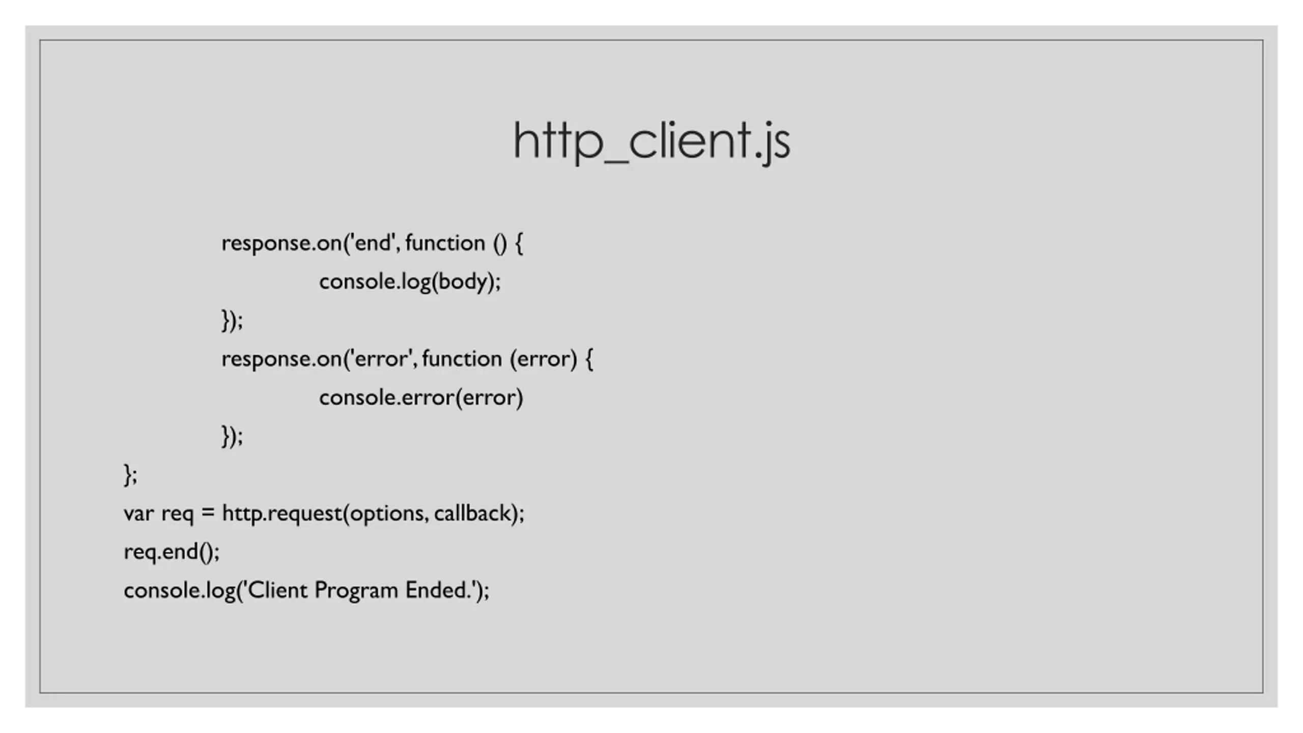 http_client.js response.on('end', function () { console.log(body); }); response.on('error', function (error) { console.error(error) }); }; var req = http.request(options, callback); req.end(); console.log('Client Program Ended.');