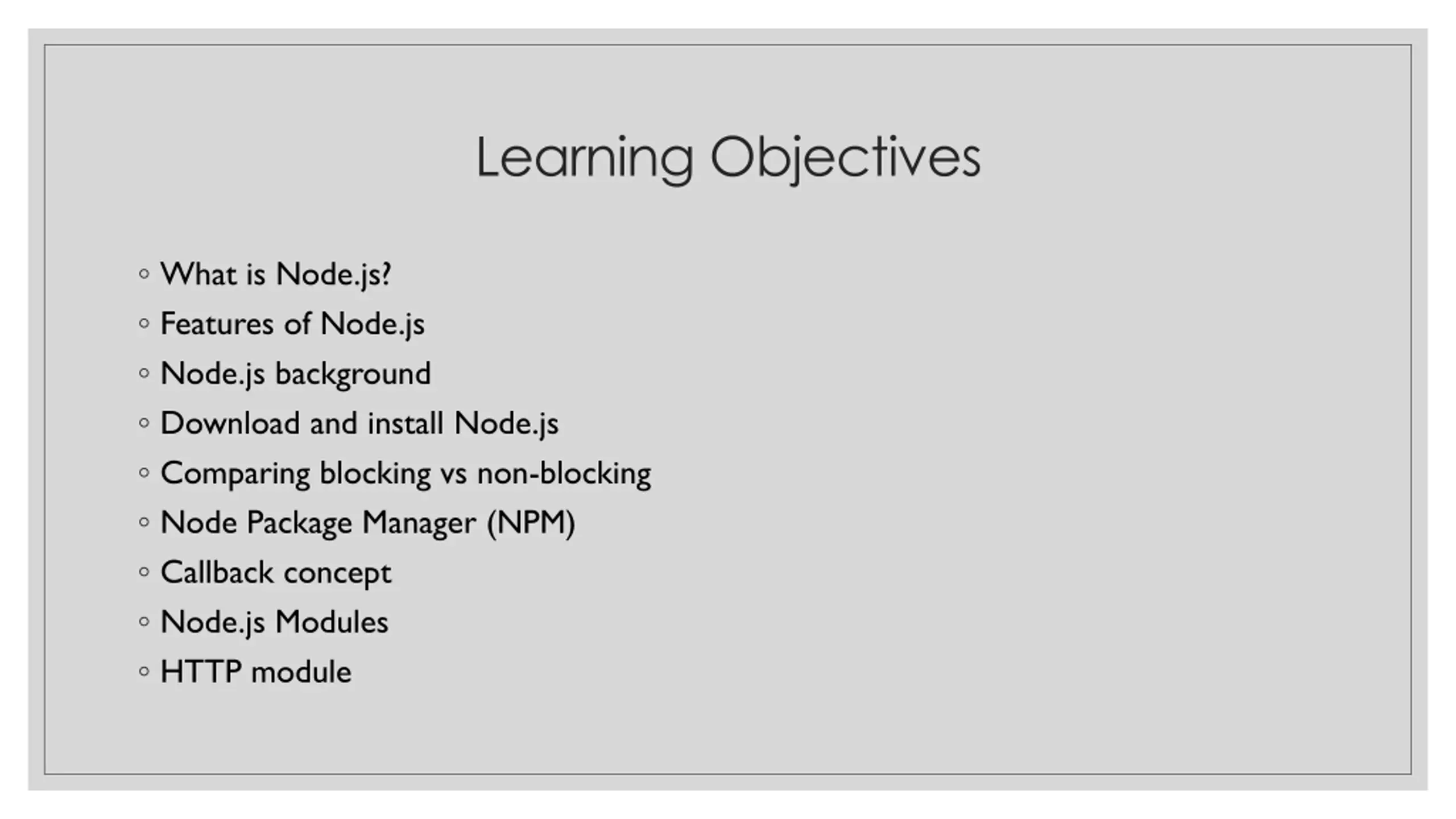 Learning Objectives What is Node.js? Features of Node.js Node.js background Download and install Node.js Comparing blocking vs non-blocking Node Package Manager (NPM) Callback concept Node.js Modules HTTP module